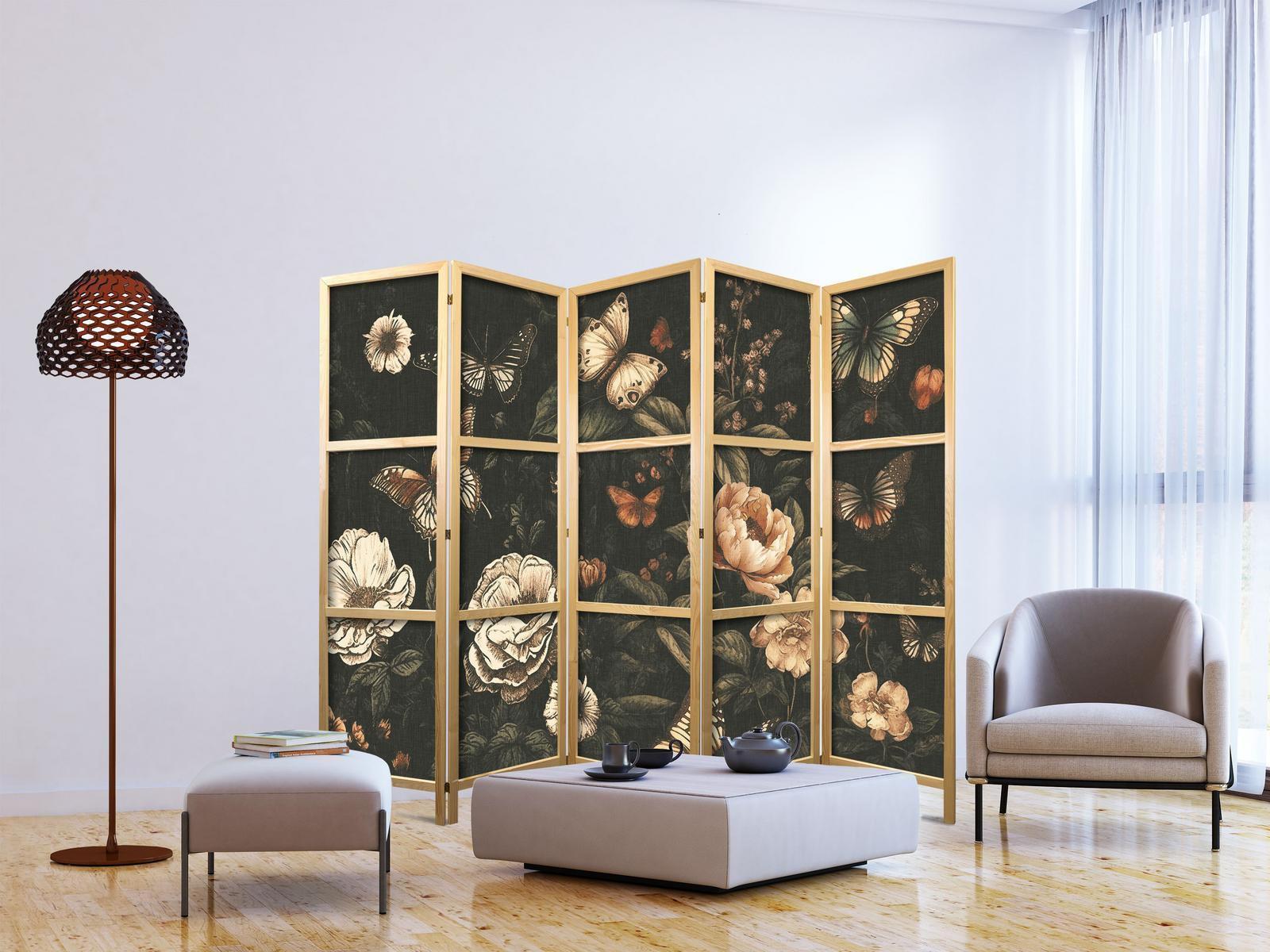 Japanischer Paravent "Japanischer Paravent - Mysterious Garden - Butterflies Flying Over Flowers - Rustic Evening"