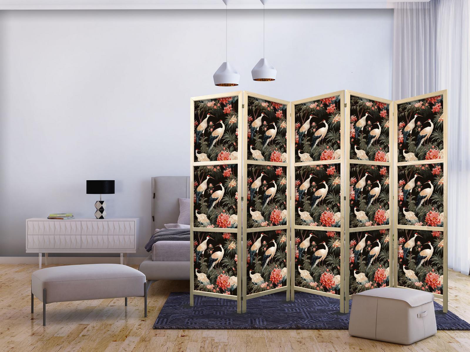 Japanischer Paravent "Japanischer Paravent - Ornament with birds - silhouettes of cranes and peony flowers on a dark background"