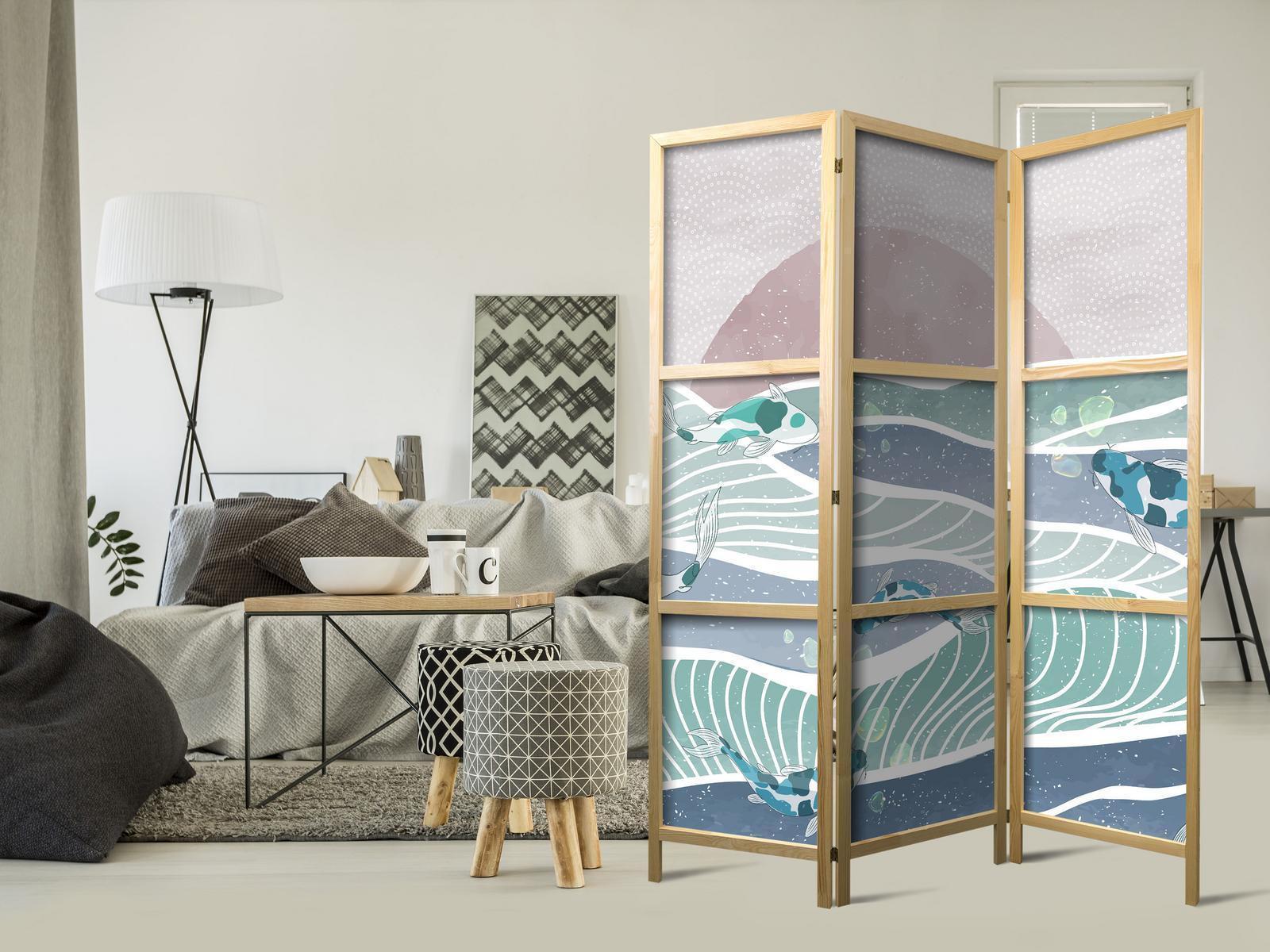 Liegen Ihnen der japanische Stil und die japanische Kultur am Herzen? Aber nicht nahe genug, um dort zu leben oder diesen Teil der Welt zu besuchen? Sind Sie auf der Suche nach einer modernen Dekoration für Ihr Zuhause? Sehen Sie sich die japanischen Paravents an. Dieses vergessene dekorative Element ist sowohl zu Hause als auch im Büro sehr nützlich. Für wenig Geld können Sie Ihre Wohnung fast wie neu einrichten. Japanische Paravents fügen sich perfekt in jeden Einrichtungsstil ein. Ein Paravent "Japanischer Paravent - Picturesque Landscape with Fish - Sunset and Koi Fish in Shades of Turquoise and Blue Floating Above Water" ist nicht nur eine tolle Dekorationsidee, sondern auch eine praktische Möglichkeit, für Privatsphäre zu sorgen. Müssen Sie aus Ihrem Wohnzimmer zwei Räume machen? Ein japanischer Paravent ist in einem solchen Fall die ideale Lösung. Darüber hinaus unterstreicht das einseitig aufgedruckte Motiv mit Bezug zu Japan Ihr Interesse an der orientalischen Kultur. Wenn Sie in einer Einzimmerwohnung leben, ist japanischer Paravent eine gute Lösung, um die verschiedenen Bereiche voneinander zu trennen. Auf diese Weise schaffen Sie definierte Bereiche für das Esszimmer oder das Wohnzimmer oder sogar trennen Ihre Home-Office-Ecke ab und nutzen ein schönes Objekt, das viel Charme in Ihr Interieur bringt.