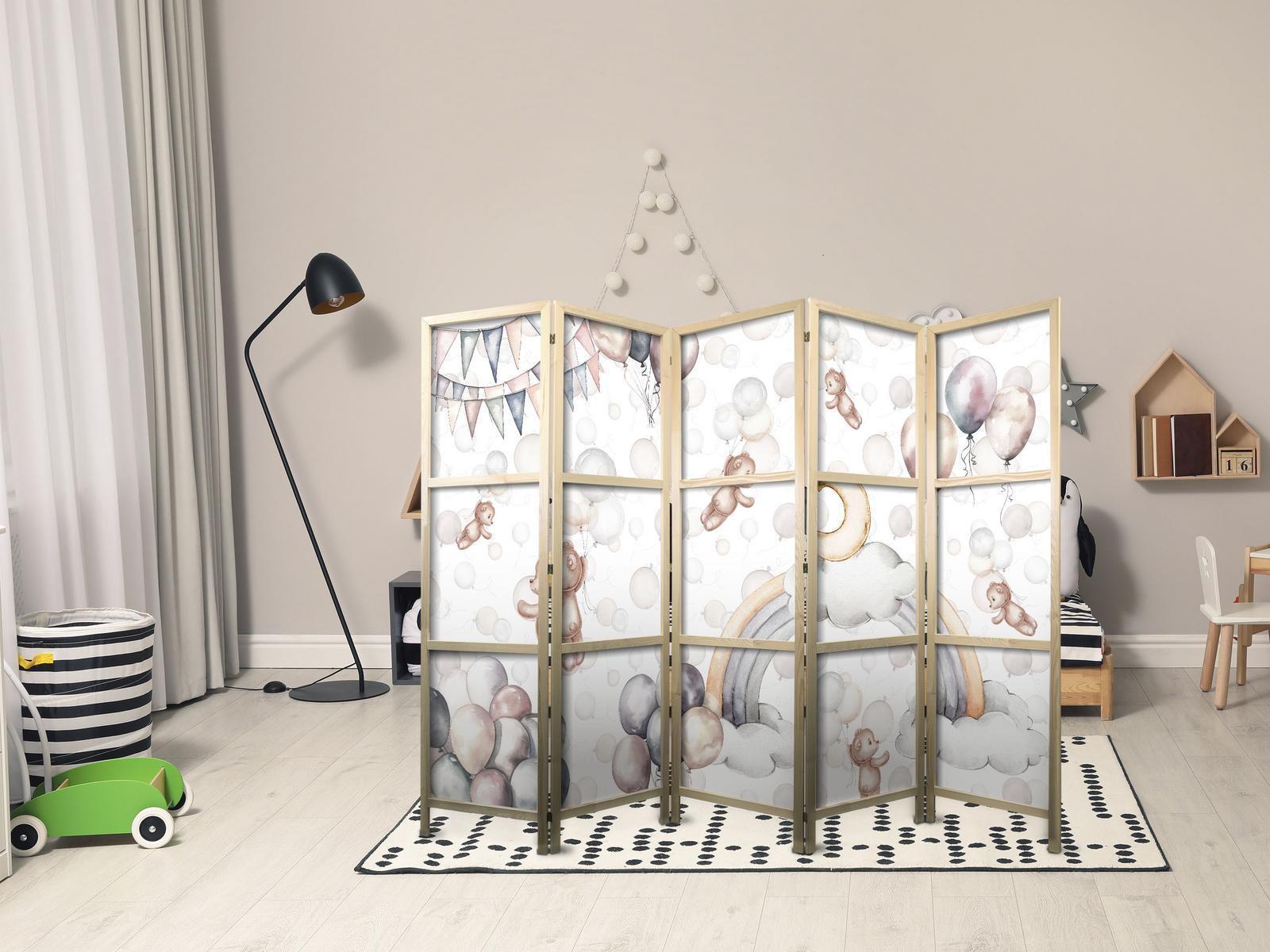 Japanischer Paravent - Plush Bears with Balloons - Flying light-brown bears among balloons - clouds - and rainbows in subdued - pastel colors