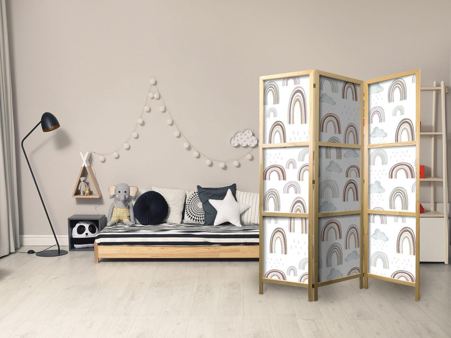 Liegen Ihnen der japanische Stil und die japanische Kultur am Herzen? Aber nicht nahe genug, um dort zu leben oder diesen Teil der Welt zu besuchen? Sind Sie auf der Suche nach einer modernen Dekoration für Ihr Zuhause? Sehen Sie sich die japanischen Paravents an. Dieses vergessene dekorative Element ist sowohl zu Hause als auch im Büro sehr nützlich. Für wenig Geld können Sie Ihre Wohnung fast wie neu einrichten. Japanische Paravents fügen sich perfekt in jeden Einrichtungsstil ein. Ein Paravent "Japanischer Paravent - Rainbows and Clouds - Various-sized rainbows in muted colors among rain clouds in a pale blue shade." ist nicht nur eine tolle Dekorationsidee, sondern auch eine praktische Möglichkeit, für Privatsphäre zu sorgen. Müssen Sie aus Ihrem Wohnzimmer zwei Räume machen? Ein japanischer Paravent ist in einem solchen Fall die ideale Lösung. Darüber hinaus unterstreicht das einseitig aufgedruckte Motiv mit Bezug zu Japan Ihr Interesse an der orientalischen Kultur. Wenn Sie in einer Einzimmerwohnung leben, ist japanischer Paravent eine gute Lösung, um die verschiedenen Bereiche voneinander zu trennen. Auf diese Weise schaffen Sie definierte Bereiche für das Esszimmer oder das Wohnzimmer oder sogar trennen Ihre Home-Office-Ecke ab und nutzen ein schönes Objekt, das viel Charme in Ihr Interieur bringt.