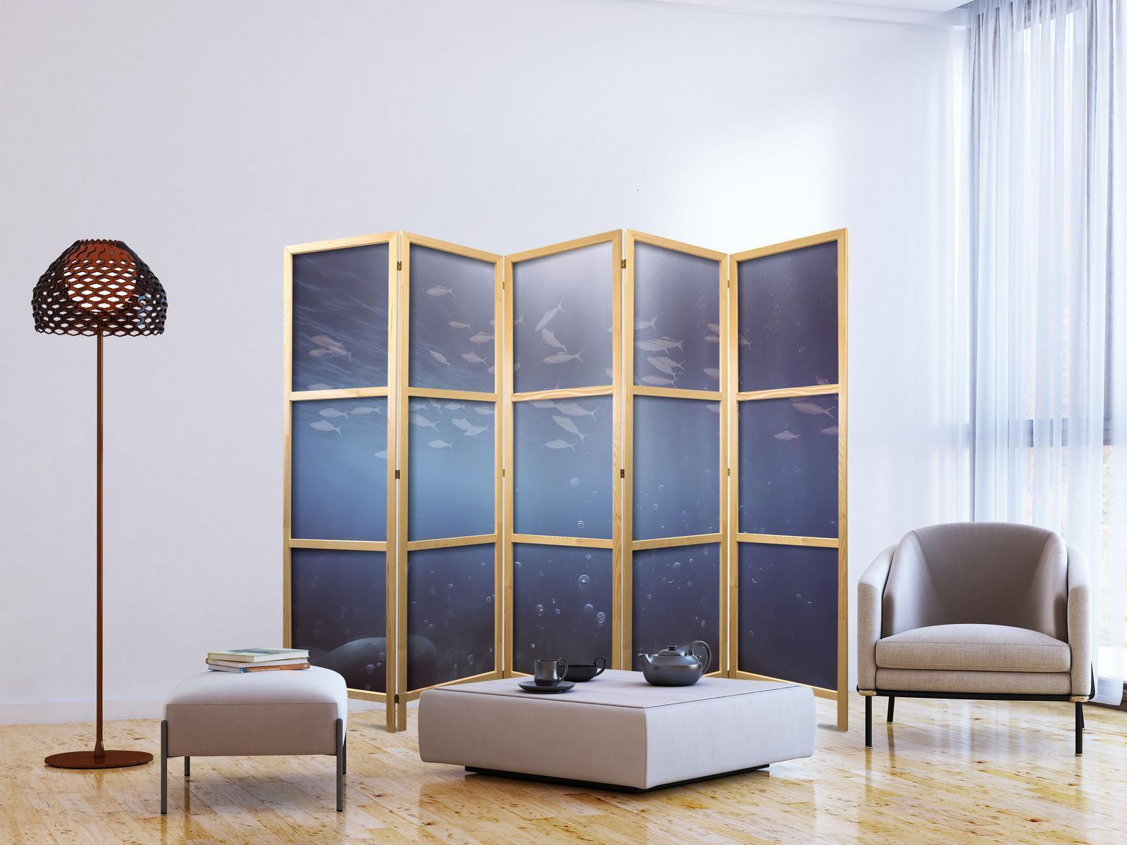Japanischer Paravent "Japanischer Paravent - School of Small Fish - Illuminated Oceanic Depth in Shades of Navy. Purple. and Gray with a School of Tiny Fish"