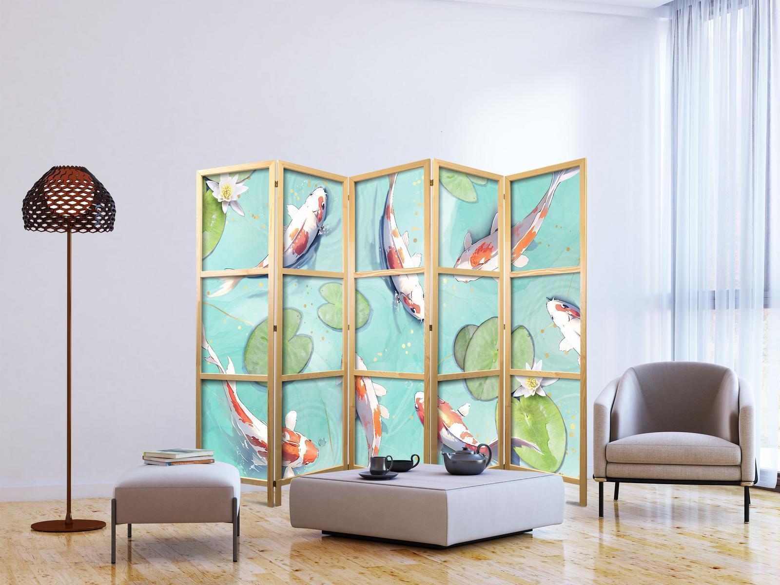Liegen Ihnen der japanische Stil und die japanische Kultur am Herzen? Aber nicht nahe genug, um dort zu leben oder diesen Teil der Welt zu besuchen? Sind Sie auf der Suche nach einer modernen Dekoration für Ihr Zuhause? Sehen Sie sich die japanischen Paravents an. Dieses vergessene dekorative Element ist sowohl zu Hause als auch im Büro sehr nützlich. Für wenig Geld können Sie Ihre Wohnung fast wie neu einrichten. Japanische Paravents fügen sich perfekt in jeden Einrichtungsstil ein. Ein Paravent "Japanischer Paravent - Spectacular Fish - White-Orange Koi Fish Swimming in Crystal Clear Water with Water Lilies" ist nicht nur eine tolle Dekorationsidee, sondern auch eine praktische Möglichkeit, für Privatsphäre zu sorgen. Müssen Sie aus Ihrem Wohnzimmer zwei Räume machen? Ein japanischer Paravent ist in einem solchen Fall die ideale Lösung. Darüber hinaus unterstreicht das einseitig aufgedruckte Motiv mit Bezug zu Japan Ihr Interesse an der orientalischen Kultur. Wenn Sie in einer Einzimmerwohnung leben, ist japanischer Paravent eine gute Lösung, um die verschiedenen Bereiche voneinander zu trennen. Auf diese Weise schaffen Sie definierte Bereiche für das Esszimmer oder das Wohnzimmer oder sogar trennen Ihre Home-Office-Ecke ab und nutzen ein schönes Objekt, das viel Charme in Ihr Interieur bringt.