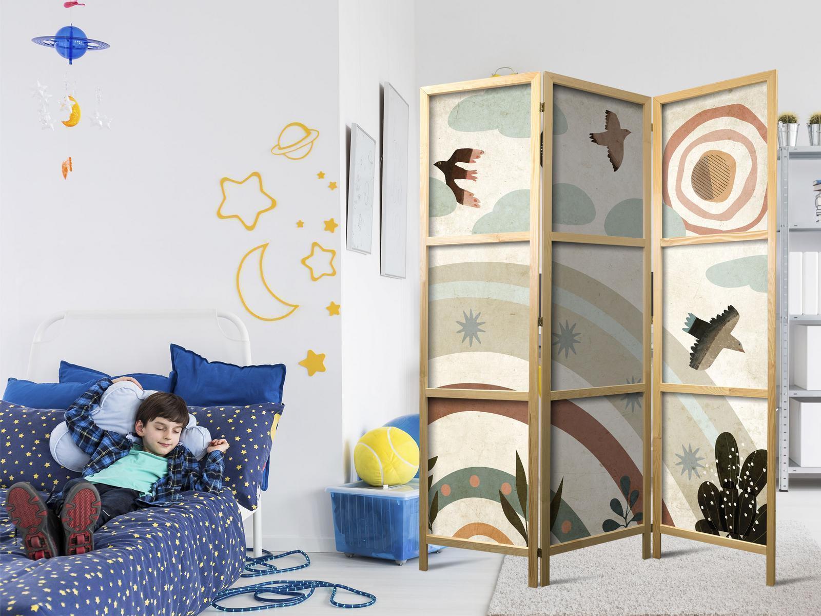 Japanischer Paravent - Sun Above the Rainbow - Birds in Subdued Colors Flying Among Clouds Above a Rainbow and Vegetation on a Light Beige Background