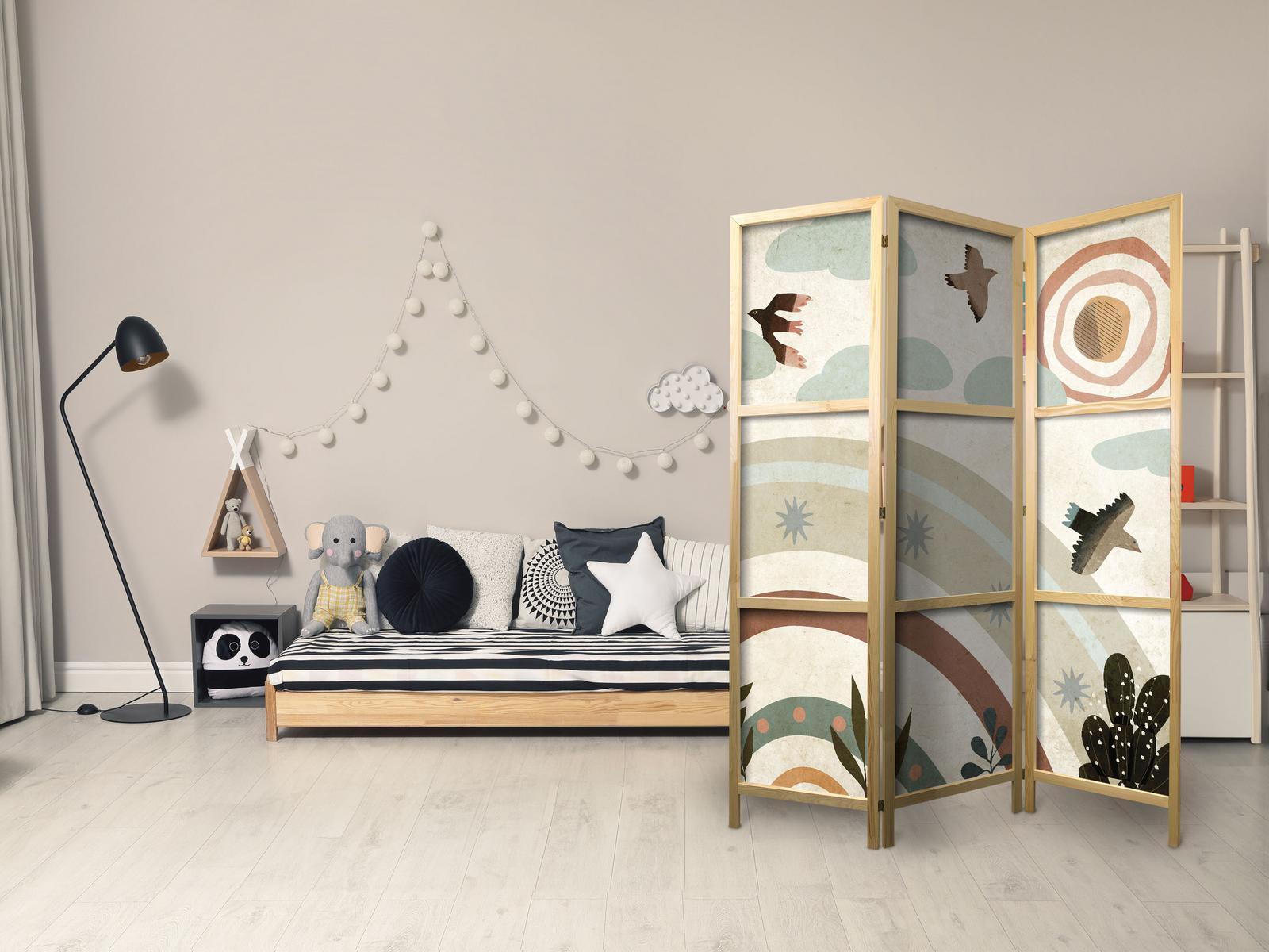 Die asiatischen Paravents aus unserer Kollektion werden auf hochwertiges Vlies gedruckt. Dank des Materials hat sich der sichere Paravent auch im Zimmer eines jungen Orient-Liebhaber bewährt. Asiatische Paravents sind perfekt für ein Restaurant in diesem Stil. Sie können die Bereiche zwischen den Tischen abgrenzen, so dass sich die Gäste wohlfühlen. Japanisches Paravent "Japanischer Paravent - Sun Above the Rainbow - Birds in Subdued Colors Flying Among Clouds Above a Rainbow and Vegetation on a Light Beige Background." ist auch eine gute Option für Schönheitssalons. Wenn Sie keine Wände bauen wollen, deren Layout Sie nach einer gewissen Zeit langweilen könnte, ist ein japanischer Paravent ideal für Sie! Es trennt die Kundenbereiche und verleiht ihnen Intimität.Details zur Produktsicherheit