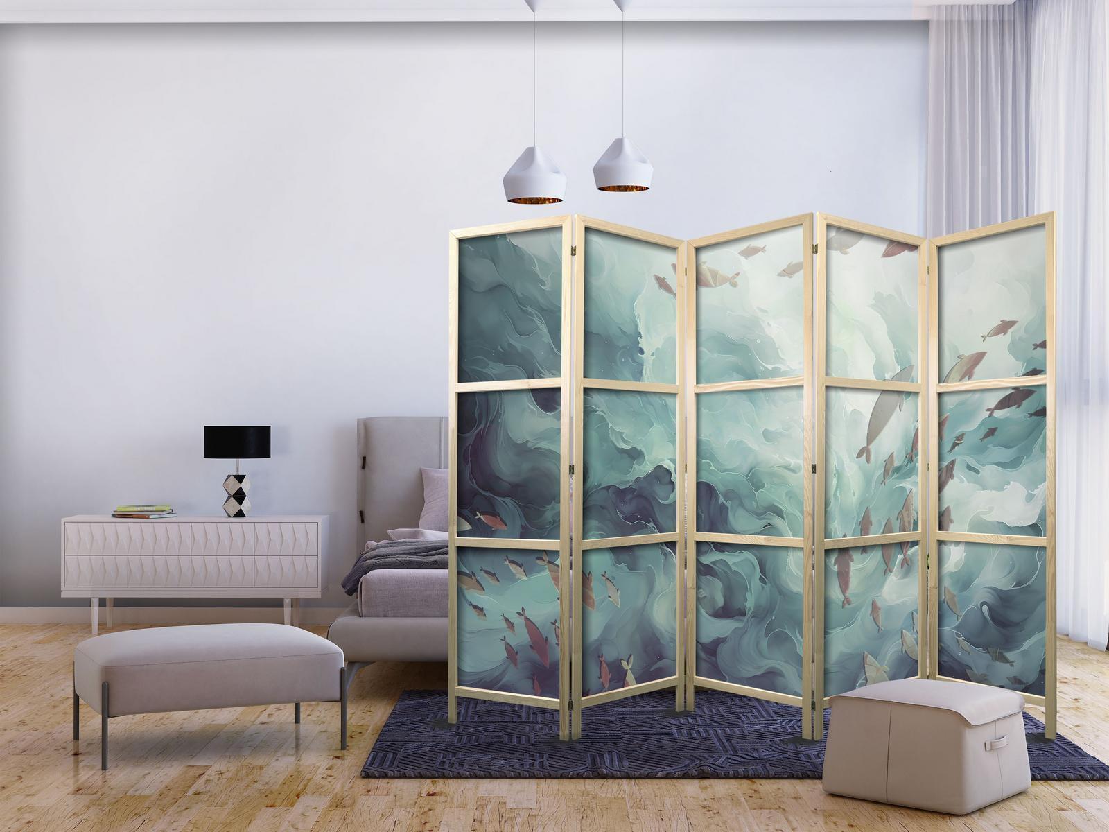 Liegen Ihnen der japanische Stil und die japanische Kultur am Herzen? Aber nicht nahe genug, um dort zu leben oder diesen Teil der Welt zu besuchen? Sind Sie auf der Suche nach einer modernen Dekoration für Ihr Zuhause? Sehen Sie sich die japanischen Paravents an. Dieses vergessene dekorative Element ist sowohl zu Hause als auch im Büro sehr nützlich. Für wenig Geld können Sie Ihre Wohnung fast wie neu einrichten. Japanische Paravents fügen sich perfekt in jeden Einrichtungsstil ein. Ein Paravent "Japanischer Paravent - Three Schools of Fish - Fish in Muted Colors Swimming in Groups in Oceanic Depths" ist nicht nur eine tolle Dekorationsidee, sondern auch eine praktische Möglichkeit, für Privatsphäre zu sorgen. Müssen Sie aus Ihrem Wohnzimmer zwei Räume machen? Ein japanischer Paravent ist in einem solchen Fall die ideale Lösung. Darüber hinaus unterstreicht das einseitig aufgedruckte Motiv mit Bezug zu Japan Ihr Interesse an der orientalischen Kultur. Wenn Sie in einer Einzimmerwohnung leben, ist japanischer Paravent eine gute Lösung, um die verschiedenen Bereiche voneinander zu trennen. Auf diese Weise schaffen Sie definierte Bereiche für das Esszimmer oder das Wohnzimmer oder sogar trennen Ihre Home-Office-Ecke ab und nutzen ein schönes Objekt, das viel Charme in Ihr Interieur bringt.