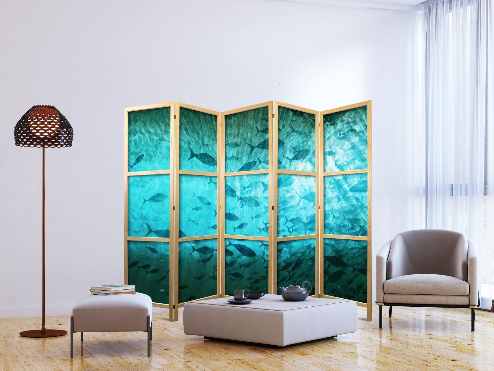 Liegen Ihnen der japanische Stil und die japanische Kultur am Herzen? Aber nicht nahe genug, um dort zu leben oder diesen Teil der Welt zu besuchen? Sind Sie auf der Suche nach einer modernen Dekoration für Ihr Zuhause? Sehen Sie sich die japanischen Paravents an. Dieses vergessene dekorative Element ist sowohl zu Hause als auch im Büro sehr nützlich. Für wenig Geld können Sie Ihre Wohnung fast wie neu einrichten. Japanische Paravents fügen sich perfekt in jeden Einrichtungsstil ein. Ein Paravent "Japanischer Paravent - Underwater Paradise - Numerous Schools of Fish in a Beautiful Turquoise-Blue Depth Illuminated by the Sunlight" ist nicht nur eine tolle Dekorationsidee, sondern auch eine praktische Möglichkeit, für Privatsphäre zu sorgen. Müssen Sie aus Ihrem Wohnzimmer zwei Räume machen? Ein japanischer Paravent ist in einem solchen Fall die ideale Lösung. Darüber hinaus unterstreicht das einseitig aufgedruckte Motiv mit Bezug zu Japan Ihr Interesse an der orientalischen Kultur. Wenn Sie in einer Einzimmerwohnung leben, ist japanischer Paravent eine gute Lösung, um die verschiedenen Bereiche voneinander zu trennen. Auf diese Weise schaffen Sie definierte Bereiche für das Esszimmer oder das Wohnzimmer oder sogar trennen Ihre Home-Office-Ecke ab und nutzen ein schönes Objekt, das viel Charme in Ihr Interieur bringt.