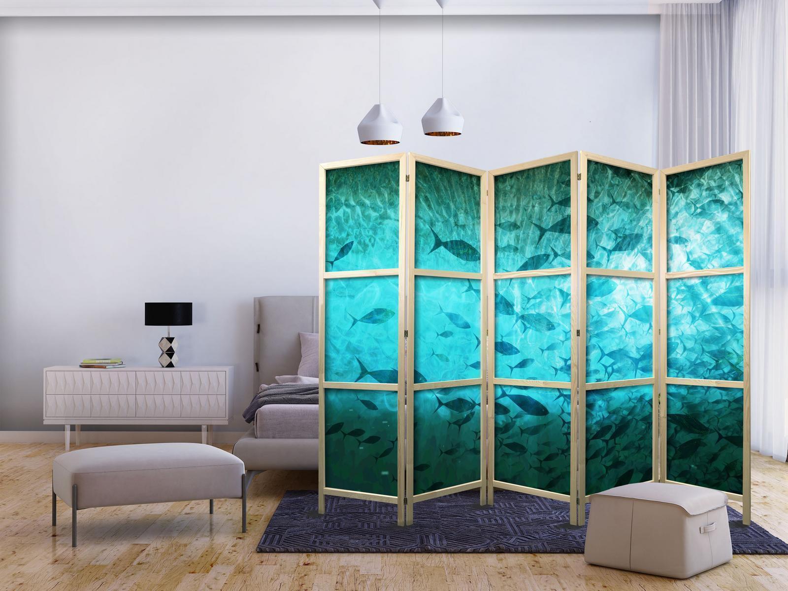 Japanischer Paravent "Japanischer Paravent - Underwater Paradise - Numerous Schools of Fish in a Beautiful Turquoise-Blue Depth Illuminated by the Sunlight"