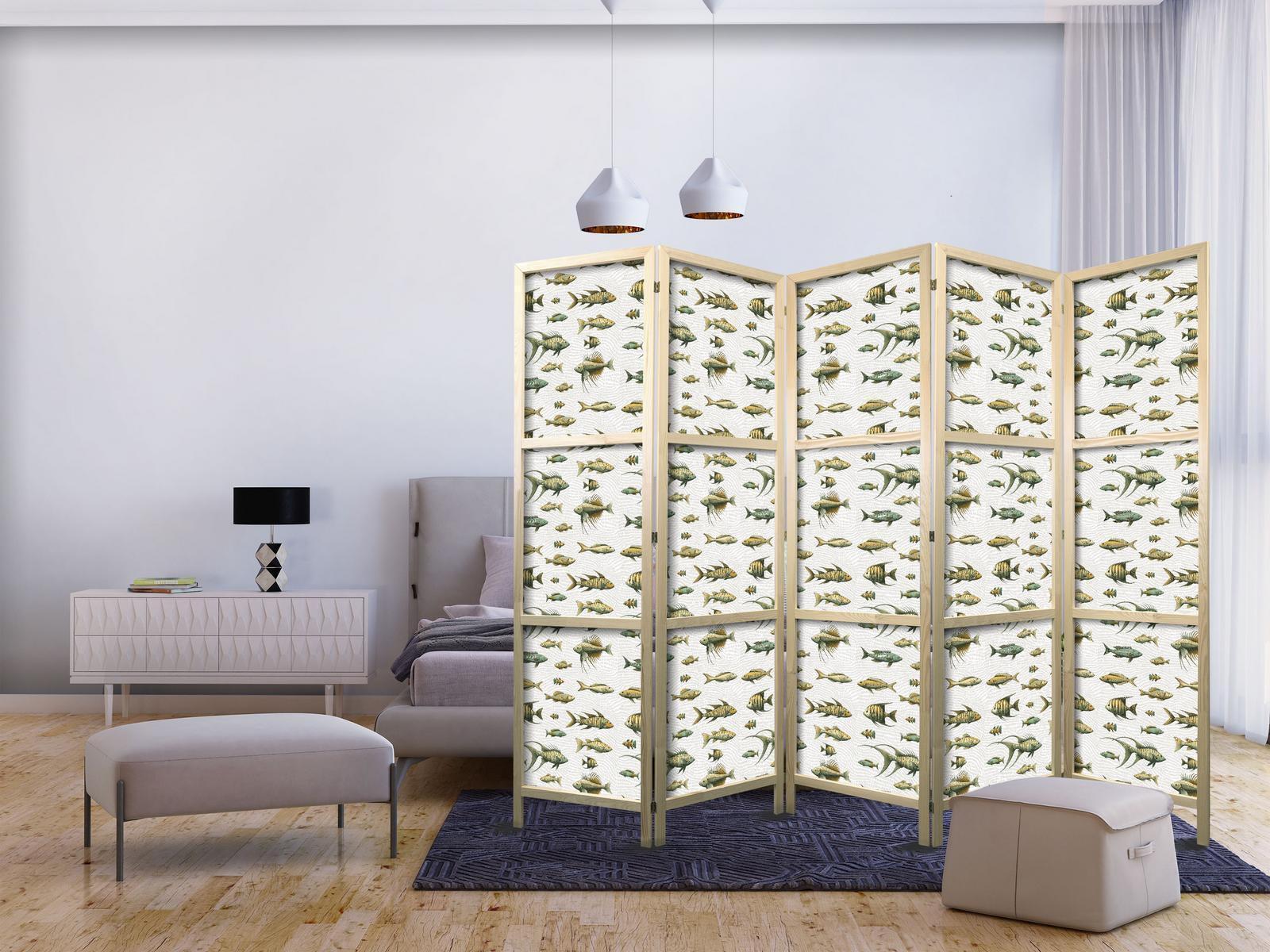 Japanischer Paravent - Unusual Species of Fish - a Cluster of Fish in Muted Colors in Retro Style Against a Background of Beige Streaks