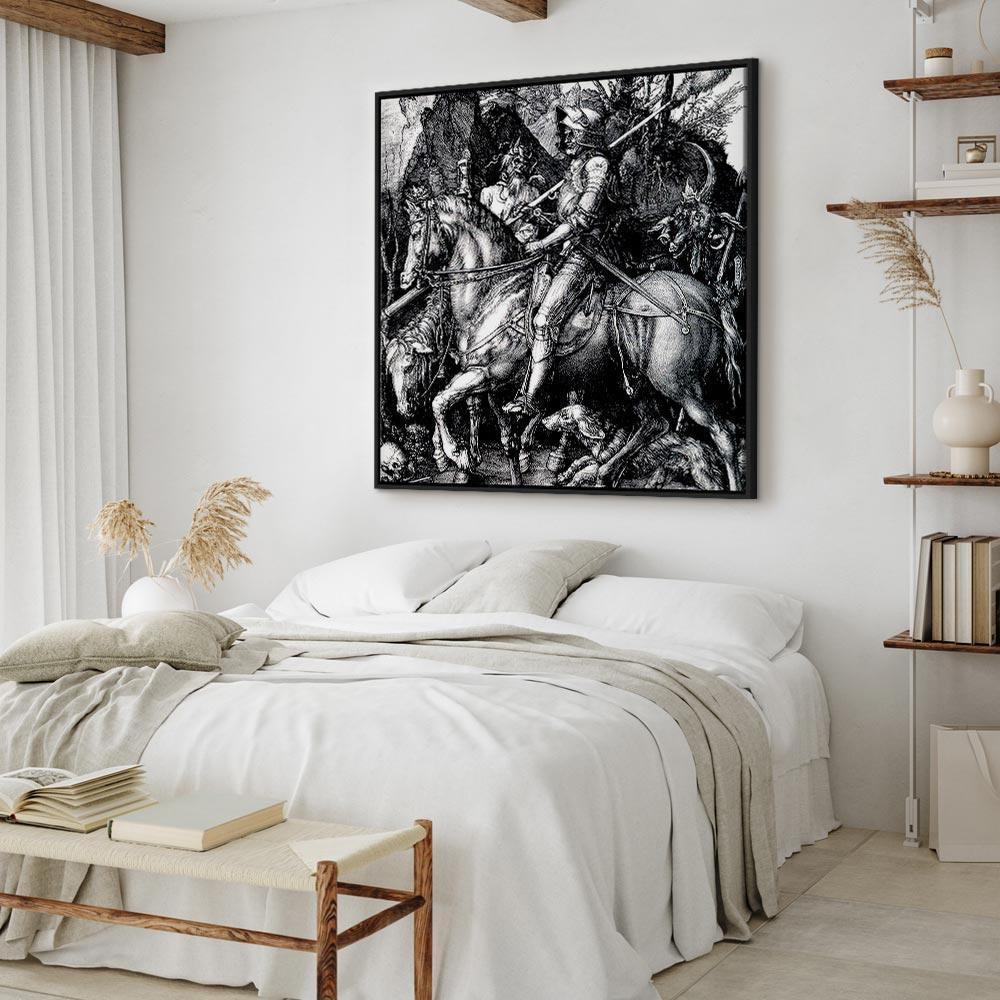 Unsere Bilder sind sicher und geruchsneutral und eignen sich daher ideal für Kinderzimmer. Die Größe wird Ihr Kind sicher beeindrucken! Bilder für Schlafzimmer sind ein echter Blickfang, genauso wie Bilder Wohnzimmer. Dekorieren Sie die Wände in Ihrem privaten Bereich mit einem Bild "Leinwandbild - Albrecht Dürer – Knight, Death and the Devil". Wir empfehlen Bilder für Schlafzimmer , die Sie beruhigen und in eine erholsame Stimmung versetzen. Bilder aus unserer Kollektion werden Ihrem Interieur eine außergewöhnliche Atmosphäre verleihen. Unabhängig vom Raum schaffen auch Kunst Bilder eine gemütliche Atmosphäre für die Gäste. Massive Holzrahmen unterstreichen den einzigartigen Charakter der Schlafzimmerbilder, und ein schneller und sicherer Versand ist ein weiterer Vorteil, der für diese Wanddekorationen spricht Leinwandbilder sind in fünf Varianten erhältlich, sodass jeder Kunde die perfekte Option für seine Bedürfnisse findet.Die Variante auf Strukturleinwand (Standard) ist eine universelle Dekoration, die das Haushaltsbudget nicht belastet.Für Liebhaber edler Materialien ist ein Druck auf italienischer Leinwand aus 100 % Baumwolle die ideale Wahl.Und für Fans der Malerei? Hier überzeugt die außergewöhnliche Premium-Print-Technik – ein Bild, das auf Strukturleinwand gedruckt und von Hand mit einer Schicht transparenten Gels überzogen wird, die die Pinselstriche eines Künstlers imitiert – ein „wie gemalt“-Effekt, aber zu einem günstigeren Preis.Die Variante im soliden Holzrahmen des Typs American Box mit Tiefeneffekt (zwei Rahmenfarben zur Auswahl, Motiv auf Strukturleinwand gedruckt) bietet eine klassische Lösung in neuer Form.Das Akustikbild (Druck auf Strukturleinwand mit einer zusätzlichen Schicht schallabsorbierendem Schaumstoff) ist dagegen ein Volltreffer für alle, die Ästhetik mit Funktionalität verbinden möchten.Zwar sind die beiden letzten Optionen nur für bestimmte Größen von einteiligen Bildern verfügbar, doch bei allen Varianten legen wir GRATIS die erforderliche Anzahl an Haken und Nägeln zur Montage bei.