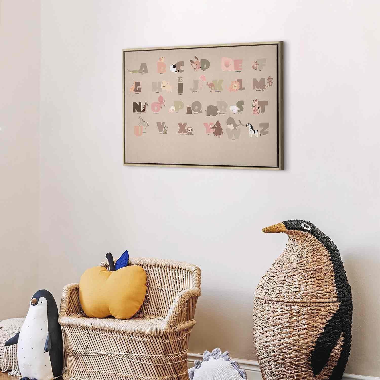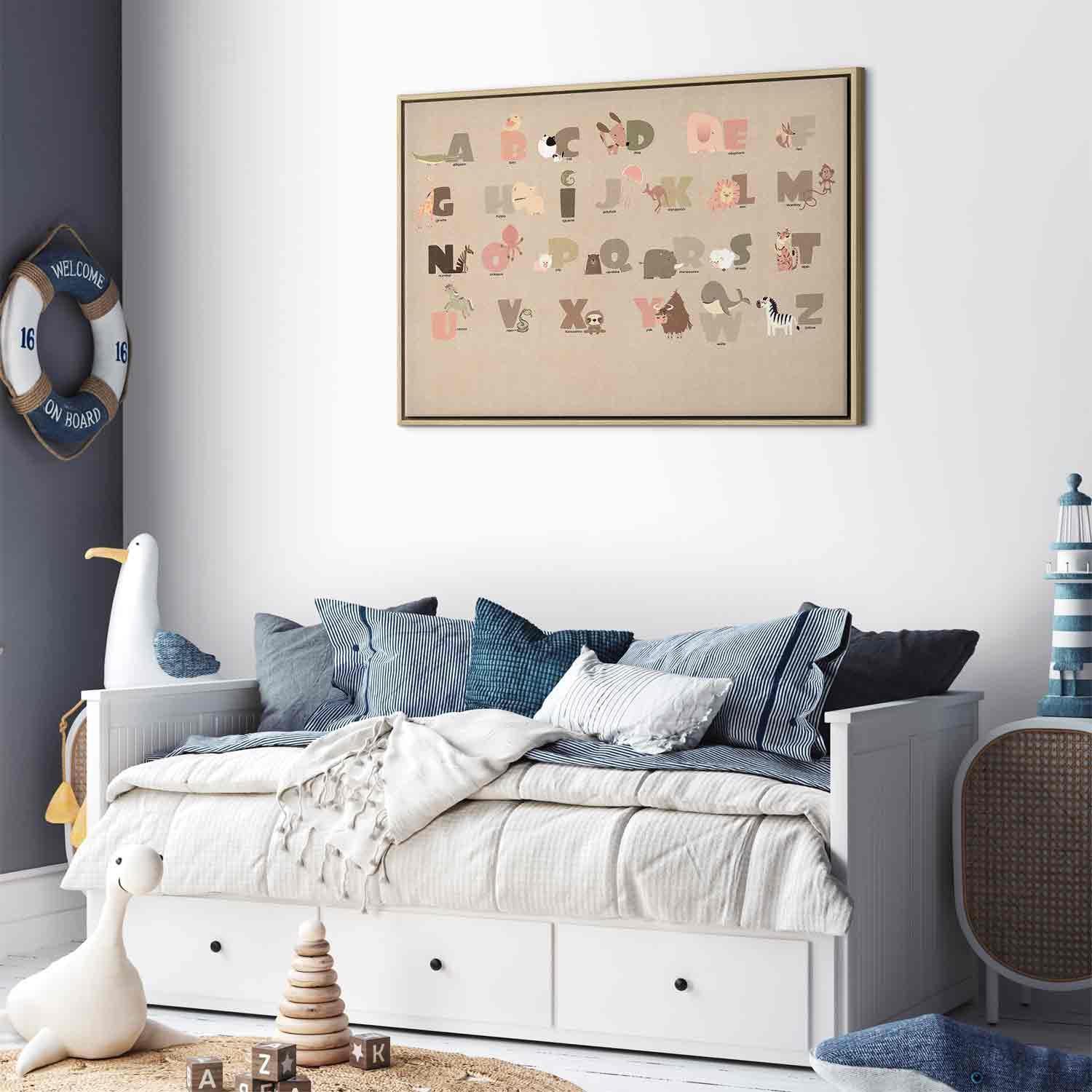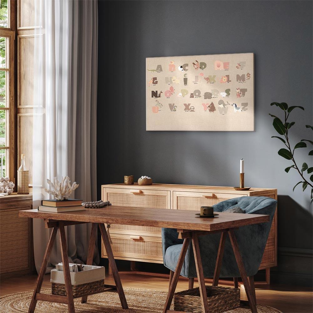 Unsere Bilder sind sicher und geruchsneutral und eignen sich daher ideal für Kinderzimmer. Die Größe wird Ihr Kind sicher beeindrucken! Bilder für Schlafzimmer sind ein echter Blickfang, genauso wie Bilder Wohnzimmer. Dekorieren Sie die Wände in Ihrem privaten Bereich mit einem Bild "Leinwandbild - Alphabet at the Zoo - Joyful Animals and Their Names on a Beige Background". Wir empfehlen Bilder für Schlafzimmer , die Sie beruhigen und in eine erholsame Stimmung versetzen. Bilder aus unserer Kollektion werden Ihrem Interieur eine außergewöhnliche Atmosphäre verleihen. Unabhängig vom Raum schaffen auch Kunst Bilder eine gemütliche Atmosphäre für die Gäste. Massive Holzrahmen unterstreichen den einzigartigen Charakter der Schlafzimmerbilder, und ein schneller und sicherer Versand ist ein weiterer Vorteil, der für diese Wanddekorationen spricht Leinwandbilder sind in fünf Varianten erhältlich, sodass jeder Kunde die perfekte Option für seine Bedürfnisse findet.Die Variante auf Strukturleinwand (Standard) ist eine universelle Dekoration, die das Haushaltsbudget nicht belastet.Für Liebhaber edler Materialien ist ein Druck auf italienischer Leinwand aus 100 % Baumwolle die ideale Wahl.Und für Fans der Malerei? Hier überzeugt die außergewöhnliche Premium-Print-Technik – ein Bild, das auf Strukturleinwand gedruckt und von Hand mit einer Schicht transparenten Gels überzogen wird, die die Pinselstriche eines Künstlers imitiert – ein „wie gemalt“-Effekt, aber zu einem günstigeren Preis.Die Variante im soliden Holzrahmen des Typs American Box mit Tiefeneffekt (zwei Rahmenfarben zur Auswahl, Motiv auf Strukturleinwand gedruckt) bietet eine klassische Lösung in neuer Form.Das Akustikbild (Druck auf Strukturleinwand mit einer zusätzlichen Schicht schallabsorbierendem Schaumstoff) ist dagegen ein Volltreffer für alle, die Ästhetik mit Funktionalität verbinden möchten.Zwar sind die beiden letzten Optionen nur für bestimmte Größen von einteiligen Bildern verfügbar, doch bei allen Varianten legen wir GRATIS die erforderliche Anzahl an Haken und Nägeln zur Montage bei.