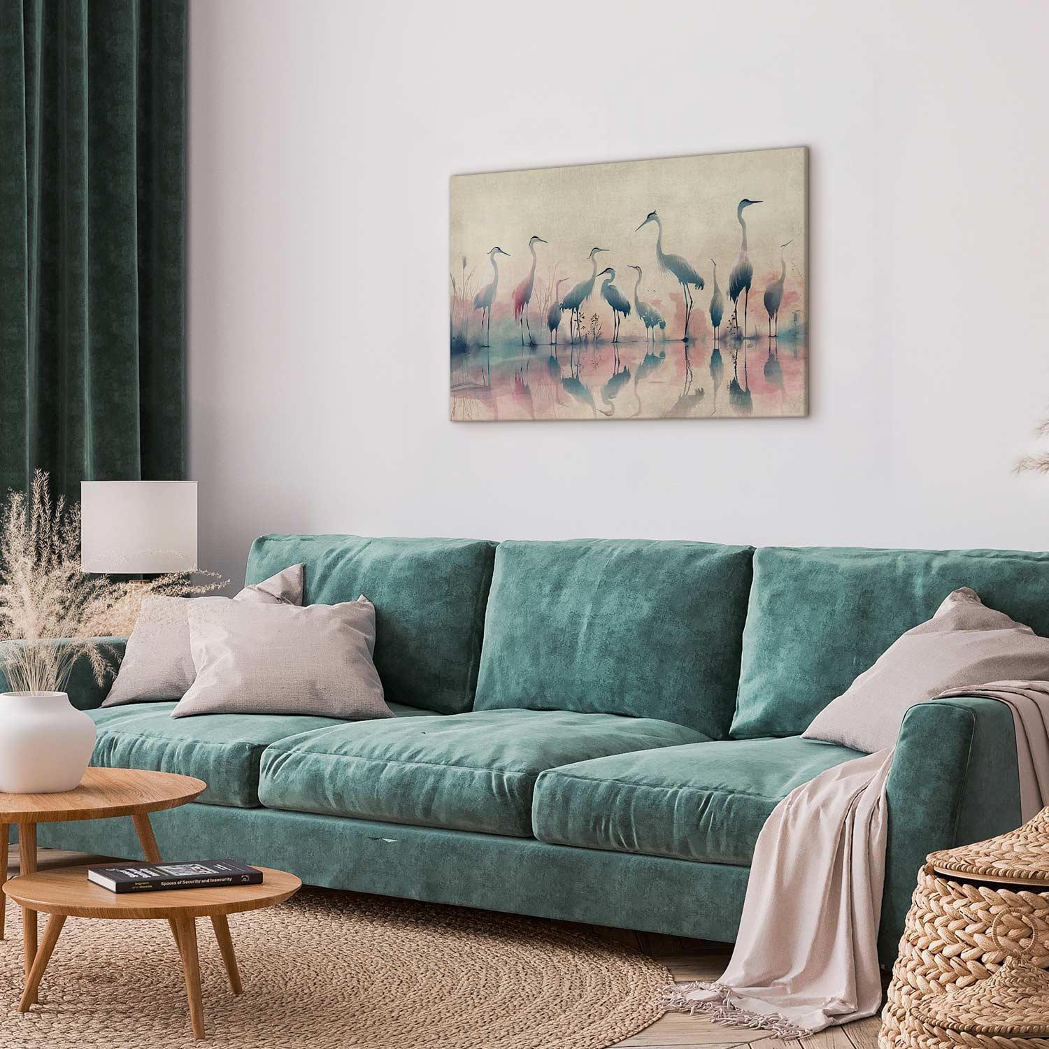 Unsere Bilder sind sicher und geruchsneutral und eignen sich daher ideal für Kinderzimmer. Die Größe wird Ihr Kind sicher beeindrucken! Bilder für Schlafzimmer sind ein echter Blickfang, genauso wie Bilder Wohnzimmer. Dekorieren Sie die Wände in Ihrem privaten Bereich mit einem Bild "Leinwandbild - Birds by the lake - herons painted in watercolour in delicate grey and pink colours". Wir empfehlen Bilder für Schlafzimmer , die Sie beruhigen und in eine erholsame Stimmung versetzen. Bilder aus unserer Kollektion werden Ihrem Interieur eine außergewöhnliche Atmosphäre verleihen. Unabhängig vom Raum schaffen auch Kunst Bilder eine gemütliche Atmosphäre für die Gäste. Massive Holzrahmen unterstreichen den einzigartigen Charakter der Schlafzimmerbilder, und ein schneller und sicherer Versand ist ein weiterer Vorteil, der für diese Wanddekorationen spricht Leinwandbilder sind in fünf Varianten erhältlich, sodass jeder Kunde die perfekte Option für seine Bedürfnisse findet.Die Variante auf Strukturleinwand (Standard) ist eine universelle Dekoration, die das Haushaltsbudget nicht belastet.Für Liebhaber edler Materialien ist ein Druck auf italienischer Leinwand aus 100 % Baumwolle die ideale Wahl.Und für Fans der Malerei? Hier überzeugt die außergewöhnliche Premium-Print-Technik – ein Bild, das auf Strukturleinwand gedruckt und von Hand mit einer Schicht transparenten Gels überzogen wird, die die Pinselstriche eines Künstlers imitiert – ein „wie gemalt“-Effekt, aber zu einem günstigeren Preis.Die Variante im soliden Holzrahmen des Typs American Box mit Tiefeneffekt (zwei Rahmenfarben zur Auswahl, Motiv auf Strukturleinwand gedruckt) bietet eine klassische Lösung in neuer Form.Das Akustikbild (Druck auf Strukturleinwand mit einer zusätzlichen Schicht schallabsorbierendem Schaumstoff) ist dagegen ein Volltreffer für alle, die Ästhetik mit Funktionalität verbinden möchten.Zwar sind die beiden letzten Optionen nur für bestimmte Größen von einteiligen Bildern verfügbar, doch bei allen Varianten legen wir GRATIS die erforderliche Anzahl an Haken und Nägeln zur Montage bei.