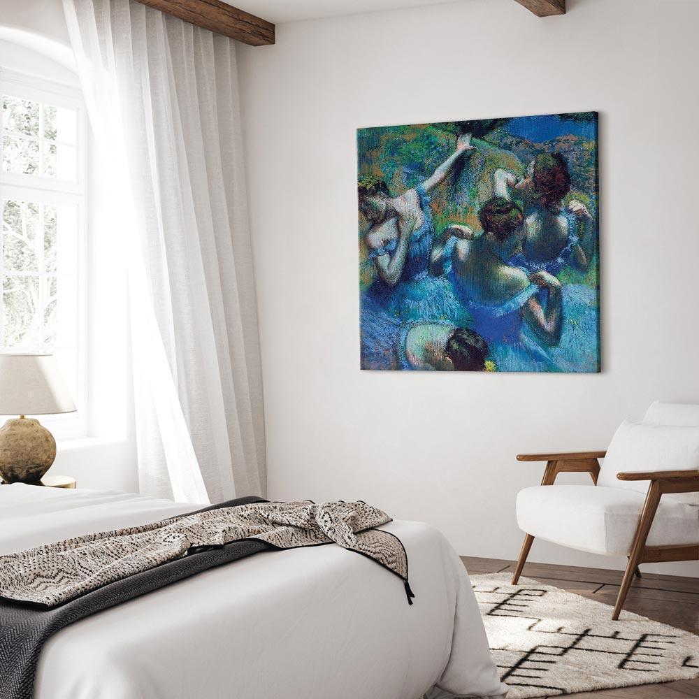 Unsere Bilder sind sicher und geruchsneutral und eignen sich daher ideal für Kinderzimmer. Die Größe wird Ihr Kind sicher beeindrucken! Bilder für Schlafzimmer sind ein echter Blickfang, genauso wie Bilder Wohnzimmer. Dekorieren Sie die Wände in Ihrem privaten Bereich mit einem Bild "Leinwandbild - Edgar Degas – Blue Dancers II". Wir empfehlen Bilder für Schlafzimmer , die Sie beruhigen und in eine erholsame Stimmung versetzen. Bilder aus unserer Kollektion werden Ihrem Interieur eine außergewöhnliche Atmosphäre verleihen. Unabhängig vom Raum schaffen auch Kunst Bilder eine gemütliche Atmosphäre für die Gäste. Massive Holzrahmen unterstreichen den einzigartigen Charakter der Schlafzimmerbilder, und ein schneller und sicherer Versand ist ein weiterer Vorteil, der für diese Wanddekorationen spricht Leinwandbilder sind in fünf Varianten erhältlich, sodass jeder Kunde die perfekte Option für seine Bedürfnisse findet.Die Variante auf Strukturleinwand (Standard) ist eine universelle Dekoration, die das Haushaltsbudget nicht belastet.Für Liebhaber edler Materialien ist ein Druck auf italienischer Leinwand aus 100 % Baumwolle die ideale Wahl.Und für Fans der Malerei? Hier überzeugt die außergewöhnliche Premium-Print-Technik – ein Bild, das auf Strukturleinwand gedruckt und von Hand mit einer Schicht transparenten Gels überzogen wird, die die Pinselstriche eines Künstlers imitiert – ein „wie gemalt“-Effekt, aber zu einem günstigeren Preis.Die Variante im soliden Holzrahmen des Typs American Box mit Tiefeneffekt (zwei Rahmenfarben zur Auswahl, Motiv auf Strukturleinwand gedruckt) bietet eine klassische Lösung in neuer Form.Das Akustikbild (Druck auf Strukturleinwand mit einer zusätzlichen Schicht schallabsorbierendem Schaumstoff) ist dagegen ein Volltreffer für alle, die Ästhetik mit Funktionalität verbinden möchten.Zwar sind die beiden letzten Optionen nur für bestimmte Größen von einteiligen Bildern verfügbar, doch bei allen Varianten legen wir GRATIS die erforderliche Anzahl an Haken und Nägeln zur Montage bei.