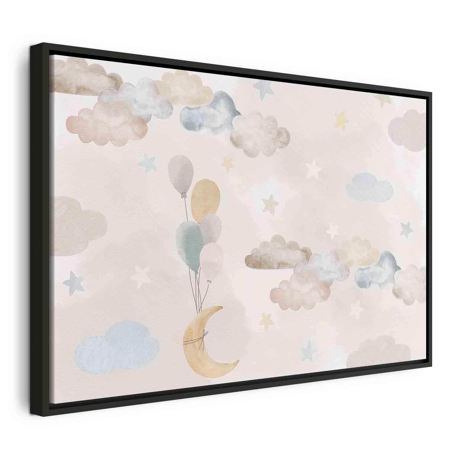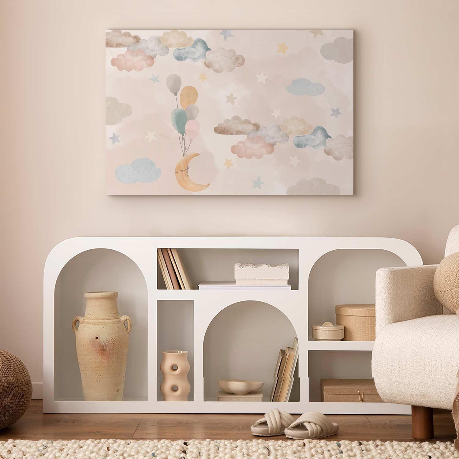 Leinwandbild - Fairy-Tale Moon - Pastel Moon with Balloons Among Colorful Clouds and Stars in Subdued Colors on a Light Background