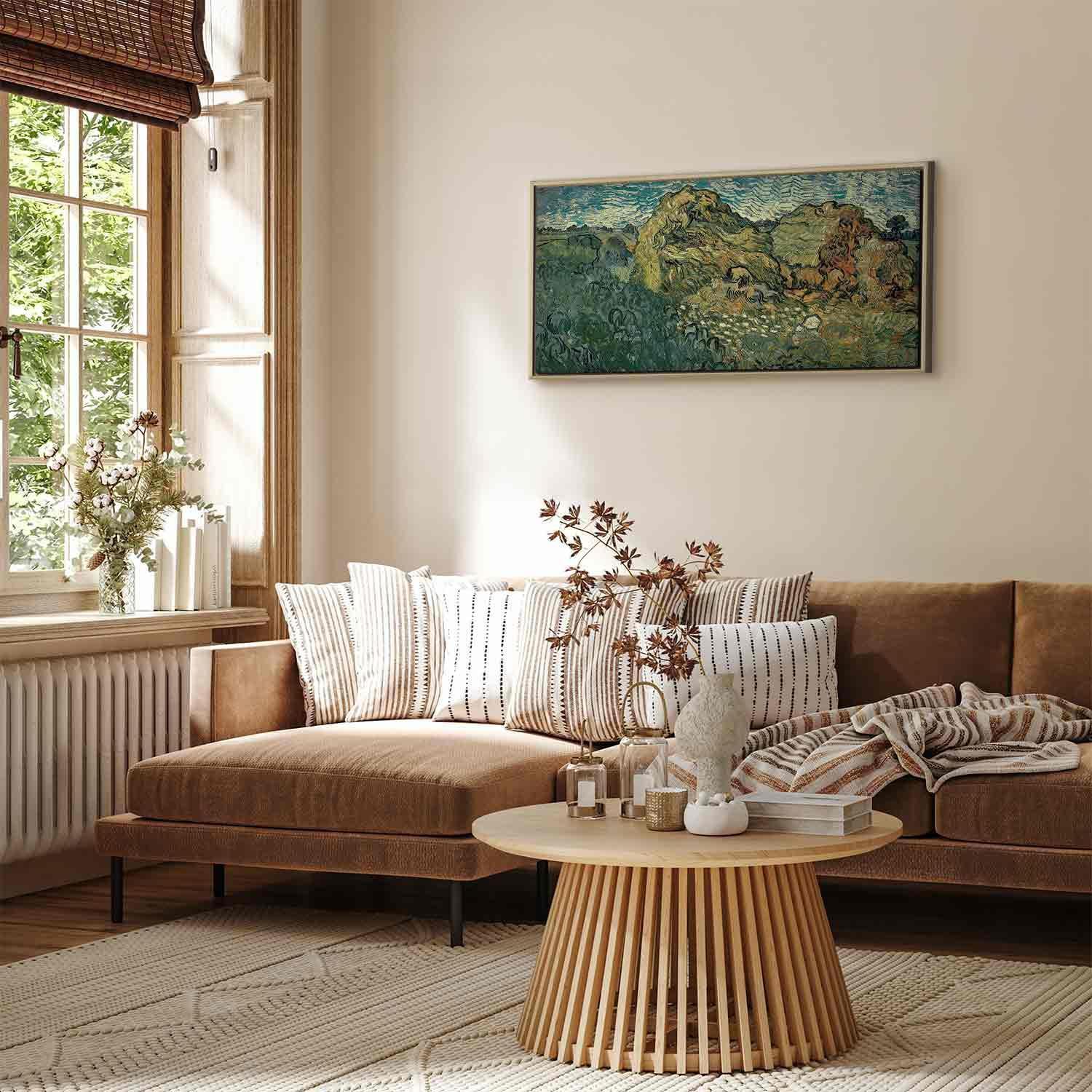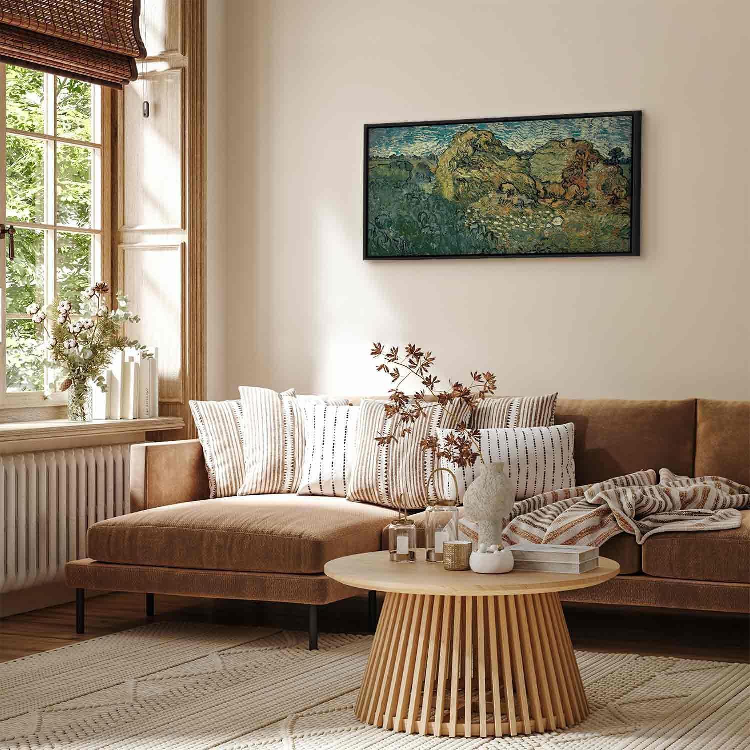 Unsere Bilder sind sicher und geruchsneutral und eignen sich daher ideal für Kinderzimmer. Die Größe wird Ihr Kind sicher beeindrucken! Bilder für Schlafzimmer sind ein echter Blickfang, genauso wie Bilder Wohnzimmer. Dekorieren Sie die Wände in Ihrem privaten Bereich mit einem Bild "Leinwandbild - Vincent Van Gogh – Field with Wheat Stacks". Wir empfehlen Bilder für Schlafzimmer , die Sie beruhigen und in eine erholsame Stimmung versetzen. Bilder aus unserer Kollektion werden Ihrem Interieur eine außergewöhnliche Atmosphäre verleihen. Unabhängig vom Raum schaffen auch Kunst Bilder eine gemütliche Atmosphäre für die Gäste. Massive Holzrahmen unterstreichen den einzigartigen Charakter der Schlafzimmerbilder, und ein schneller und sicherer Versand ist ein weiterer Vorteil, der für diese Wanddekorationen spricht Leinwandbilder sind in fünf Varianten erhältlich, sodass jeder Kunde die perfekte Option für seine Bedürfnisse findet.Die Variante auf Strukturleinwand (Standard) ist eine universelle Dekoration, die das Haushaltsbudget nicht belastet.Für Liebhaber edler Materialien ist ein Druck auf italienischer Leinwand aus 100 % Baumwolle die ideale Wahl.Und für Fans der Malerei? Hier überzeugt die außergewöhnliche Premium-Print-Technik – ein Bild, das auf Strukturleinwand gedruckt und von Hand mit einer Schicht transparenten Gels überzogen wird, die die Pinselstriche eines Künstlers imitiert – ein „wie gemalt“-Effekt, aber zu einem günstigeren Preis.Die Variante im soliden Holzrahmen des Typs American Box mit Tiefeneffekt (zwei Rahmenfarben zur Auswahl, Motiv auf Strukturleinwand gedruckt) bietet eine klassische Lösung in neuer Form.Das Akustikbild (Druck auf Strukturleinwand mit einer zusätzlichen Schicht schallabsorbierendem Schaumstoff) ist dagegen ein Volltreffer für alle, die Ästhetik mit Funktionalität verbinden möchten.Zwar sind die beiden letzten Optionen nur für bestimmte Größen von einteiligen Bildern verfügbar, doch bei allen Varianten legen wir GRATIS die erforderliche Anzahl an Haken und Nägeln zur Montage bei.