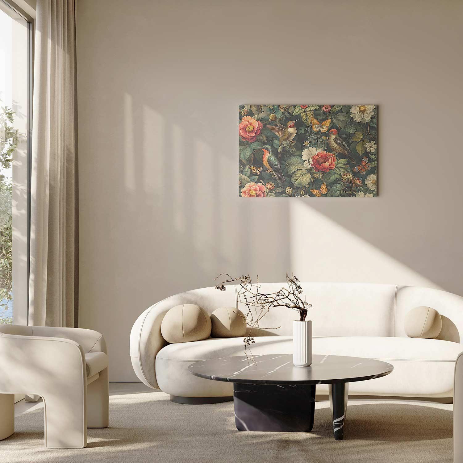 Leinwandbild - Flowers, birds and butterflies – vintage-style illustration