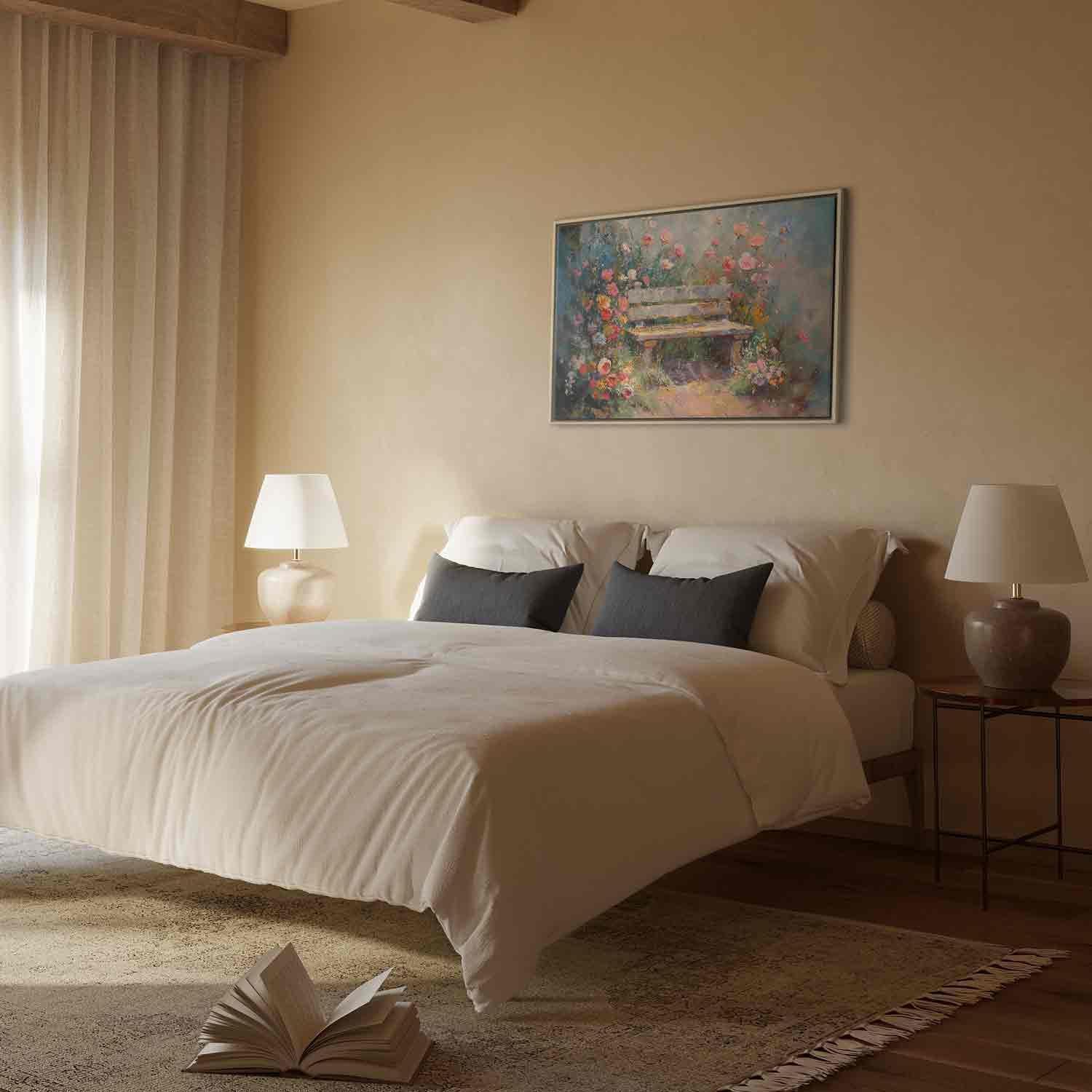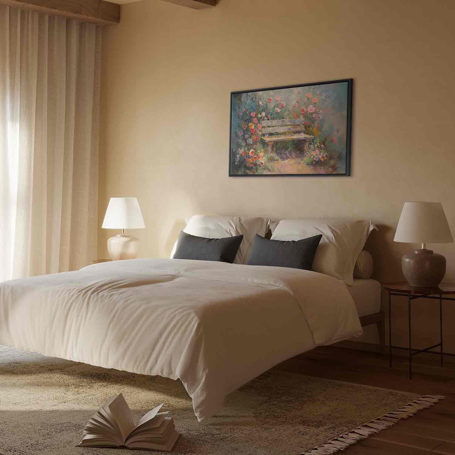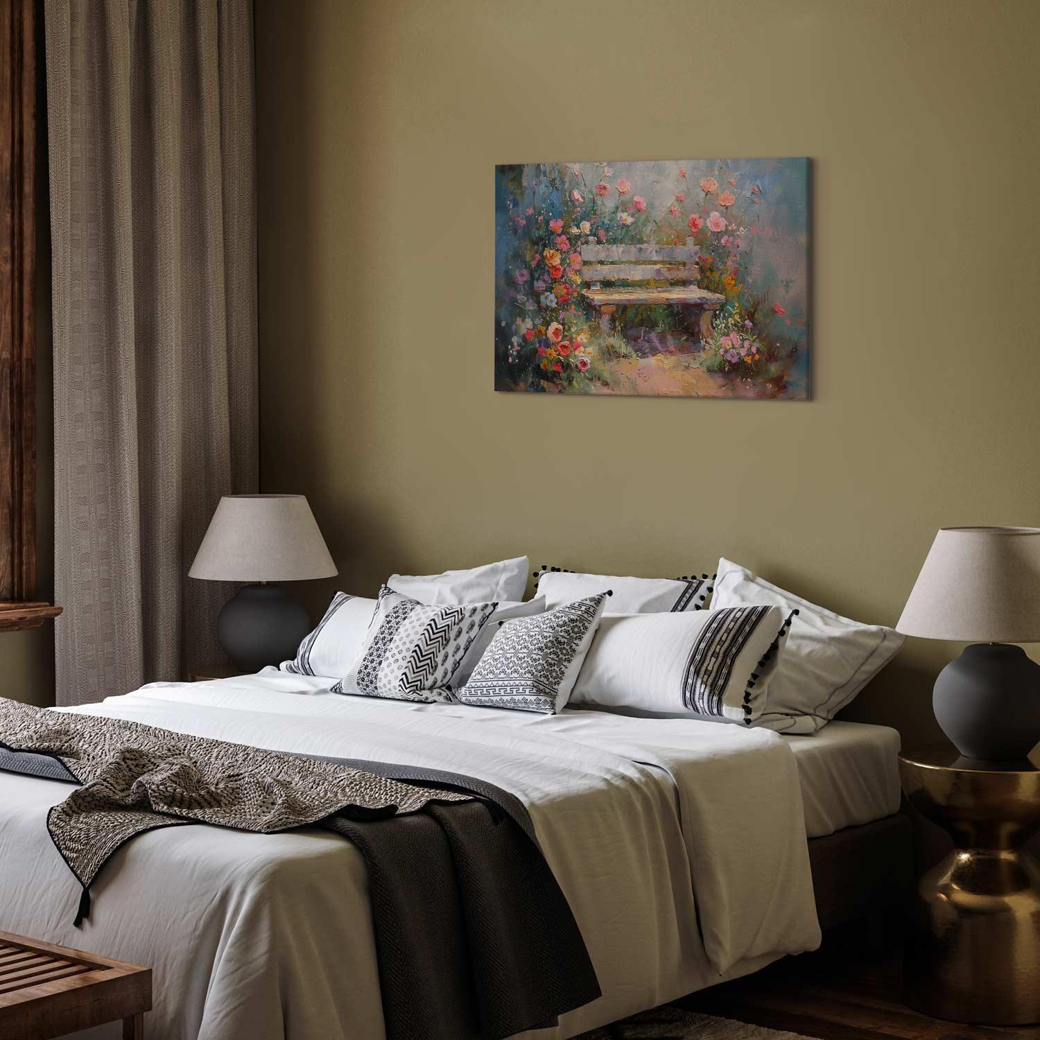 Unsere Bilder sind sicher und geruchsneutral und eignen sich daher ideal für Kinderzimmer. Die Größe wird Ihr Kind sicher beeindrucken! Bilder für Schlafzimmer sind ein echter Blickfang, genauso wie Bilder Wohnzimmer. Dekorieren Sie die Wände in Ihrem privaten Bereich mit einem Bild "Leinwandbild - Flowery bench - impressionist painting full of flowers". Wir empfehlen Bilder für Schlafzimmer , die Sie beruhigen und in eine erholsame Stimmung versetzen. Bilder aus unserer Kollektion werden Ihrem Interieur eine außergewöhnliche Atmosphäre verleihen. Unabhängig vom Raum schaffen auch Kunst Bilder eine gemütliche Atmosphäre für die Gäste. Massive Holzrahmen unterstreichen den einzigartigen Charakter der Schlafzimmerbilder, und ein schneller und sicherer Versand ist ein weiterer Vorteil, der für diese Wanddekorationen spricht Leinwandbilder sind in fünf Varianten erhältlich, sodass jeder Kunde die perfekte Option für seine Bedürfnisse findet.Die Variante auf Strukturleinwand (Standard) ist eine universelle Dekoration, die das Haushaltsbudget nicht belastet.Für Liebhaber edler Materialien ist ein Druck auf italienischer Leinwand aus 100 % Baumwolle die ideale Wahl.Und für Fans der Malerei? Hier überzeugt die außergewöhnliche Premium-Print-Technik – ein Bild, das auf Strukturleinwand gedruckt und von Hand mit einer Schicht transparenten Gels überzogen wird, die die Pinselstriche eines Künstlers imitiert – ein „wie gemalt“-Effekt, aber zu einem günstigeren Preis.Die Variante im soliden Holzrahmen des Typs American Box mit Tiefeneffekt (zwei Rahmenfarben zur Auswahl, Motiv auf Strukturleinwand gedruckt) bietet eine klassische Lösung in neuer Form.Das Akustikbild (Druck auf Strukturleinwand mit einer zusätzlichen Schicht schallabsorbierendem Schaumstoff) ist dagegen ein Volltreffer für alle, die Ästhetik mit Funktionalität verbinden möchten.Zwar sind die beiden letzten Optionen nur für bestimmte Größen von einteiligen Bildern verfügbar, doch bei allen Varianten legen wir GRATIS die erforderliche Anzahl an Haken und Nägeln zur Montage bei.