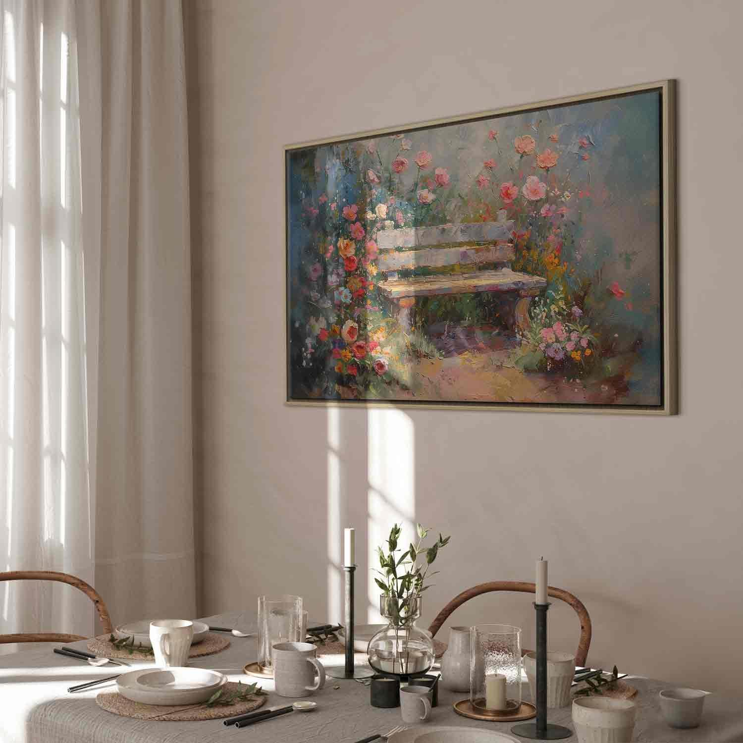 Leinwandbild - Flowery bench - impressionist painting full of flowers