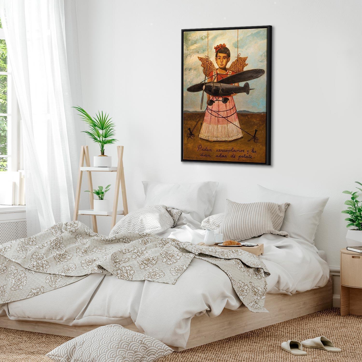 Unsere Bilder sind sicher und geruchsneutral und eignen sich daher ideal für Kinderzimmer. Die Größe wird Ihr Kind sicher beeindrucken! Bilder für Schlafzimmer sind ein echter Blickfang, genauso wie Bilder Wohnzimmer. Dekorieren Sie die Wände in Ihrem privaten Bereich mit einem Bild "Leinwandbild - Frida Kahlo – They Asked for Planes and Got Straw Wings". Wir empfehlen Bilder für Schlafzimmer , die Sie beruhigen und in eine erholsame Stimmung versetzen. Bilder aus unserer Kollektion werden Ihrem Interieur eine außergewöhnliche Atmosphäre verleihen. Unabhängig vom Raum schaffen auch Kunst Bilder eine gemütliche Atmosphäre für die Gäste. Massive Holzrahmen unterstreichen den einzigartigen Charakter der Schlafzimmerbilder, und ein schneller und sicherer Versand ist ein weiterer Vorteil, der für diese Wanddekorationen spricht Leinwandbilder sind in fünf Varianten erhältlich, sodass jeder Kunde die perfekte Option für seine Bedürfnisse findet.Die Variante auf Strukturleinwand (Standard) ist eine universelle Dekoration, die das Haushaltsbudget nicht belastet.Für Liebhaber edler Materialien ist ein Druck auf italienischer Leinwand aus 100 % Baumwolle die ideale Wahl.Und für Fans der Malerei? Hier überzeugt die außergewöhnliche Premium-Print-Technik – ein Bild, das auf Strukturleinwand gedruckt und von Hand mit einer Schicht transparenten Gels überzogen wird, die die Pinselstriche eines Künstlers imitiert – ein „wie gemalt“-Effekt, aber zu einem günstigeren Preis.Die Variante im soliden Holzrahmen des Typs American Box mit Tiefeneffekt (zwei Rahmenfarben zur Auswahl, Motiv auf Strukturleinwand gedruckt) bietet eine klassische Lösung in neuer Form.Das Akustikbild (Druck auf Strukturleinwand mit einer zusätzlichen Schicht schallabsorbierendem Schaumstoff) ist dagegen ein Volltreffer für alle, die Ästhetik mit Funktionalität verbinden möchten.Zwar sind die beiden letzten Optionen nur für bestimmte Größen von einteiligen Bildern verfügbar, doch bei allen Varianten legen wir GRATIS die erforderliche Anzahl an Haken und Nägeln zur Montage bei.