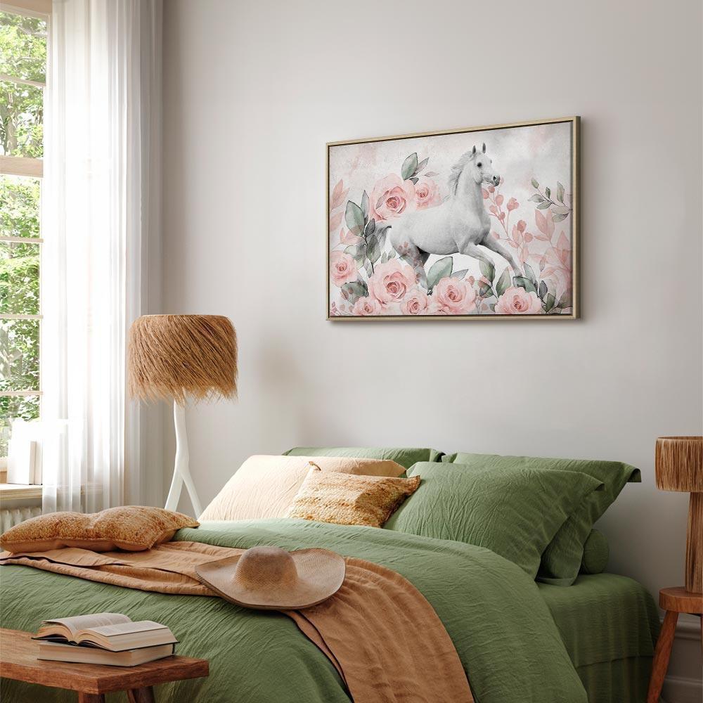 Unsere Bilder sind sicher und geruchsneutral und eignen sich daher ideal für Kinderzimmer. Die Größe wird Ihr Kind sicher beeindrucken! Bilder für Schlafzimmer sind ein echter Blickfang, genauso wie Bilder Wohnzimmer. Dekorieren Sie die Wände in Ihrem privaten Bereich mit einem Bild "Leinwandbild - Gallop Among the Roses (1 Part) Wide". Wir empfehlen Bilder für Schlafzimmer , die Sie beruhigen und in eine erholsame Stimmung versetzen. Bilder aus unserer Kollektion werden Ihrem Interieur eine außergewöhnliche Atmosphäre verleihen. Unabhängig vom Raum schaffen auch Kunst Bilder eine gemütliche Atmosphäre für die Gäste. Massive Holzrahmen unterstreichen den einzigartigen Charakter der Schlafzimmerbilder, und ein schneller und sicherer Versand ist ein weiterer Vorteil, der für diese Wanddekorationen spricht Leinwandbilder sind in fünf Varianten erhältlich, sodass jeder Kunde die perfekte Option für seine Bedürfnisse findet.Die Variante auf Strukturleinwand (Standard) ist eine universelle Dekoration, die das Haushaltsbudget nicht belastet.Für Liebhaber edler Materialien ist ein Druck auf italienischer Leinwand aus 100 % Baumwolle die ideale Wahl.Und für Fans der Malerei? Hier überzeugt die außergewöhnliche Premium-Print-Technik – ein Bild, das auf Strukturleinwand gedruckt und von Hand mit einer Schicht transparenten Gels überzogen wird, die die Pinselstriche eines Künstlers imitiert – ein „wie gemalt“-Effekt, aber zu einem günstigeren Preis.Die Variante im soliden Holzrahmen des Typs American Box mit Tiefeneffekt (zwei Rahmenfarben zur Auswahl, Motiv auf Strukturleinwand gedruckt) bietet eine klassische Lösung in neuer Form.Das Akustikbild (Druck auf Strukturleinwand mit einer zusätzlichen Schicht schallabsorbierendem Schaumstoff) ist dagegen ein Volltreffer für alle, die Ästhetik mit Funktionalität verbinden möchten.Zwar sind die beiden letzten Optionen nur für bestimmte Größen von einteiligen Bildern verfügbar, doch bei allen Varianten legen wir GRATIS die erforderliche Anzahl an Haken und Nägeln zur Montage bei.