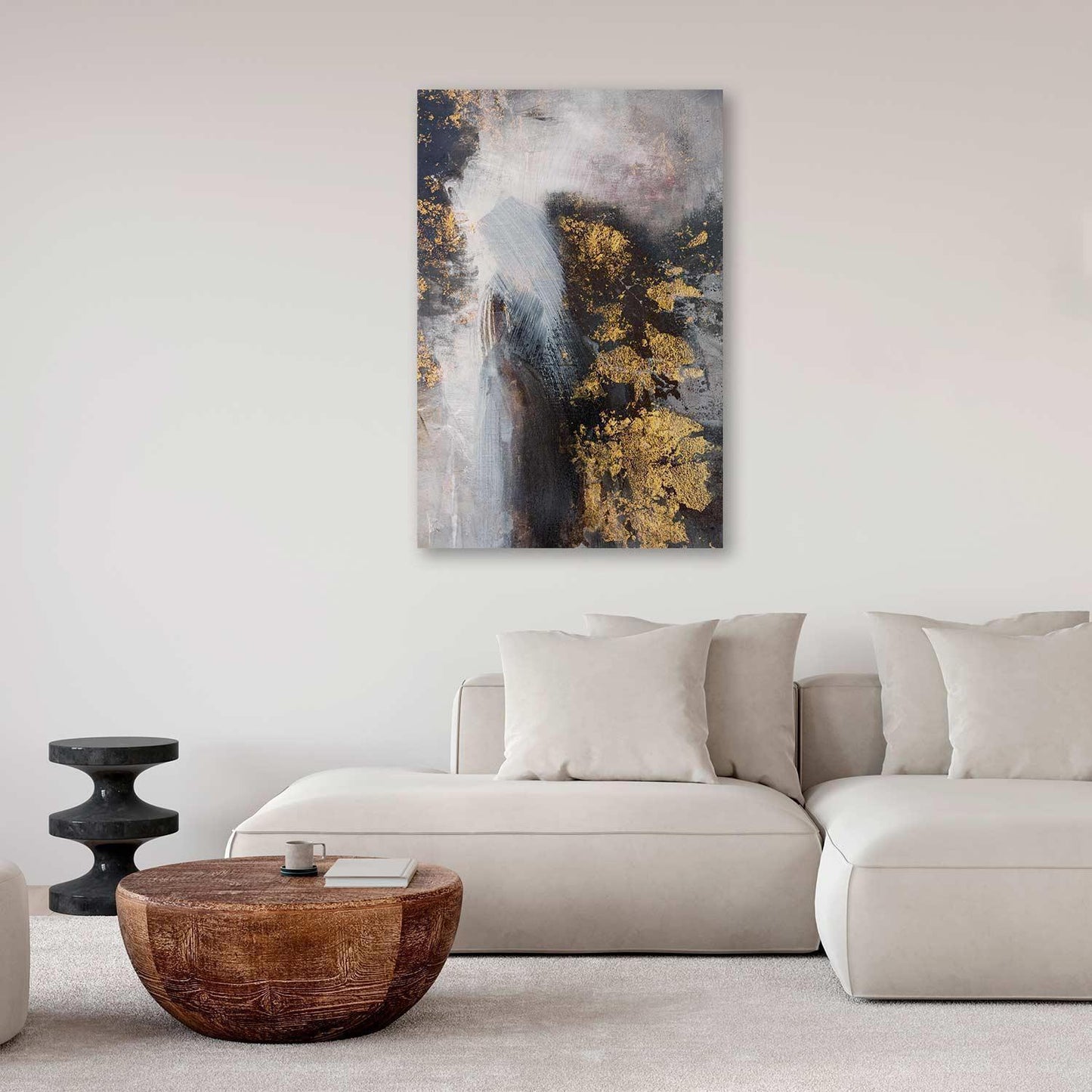 Das abstrakte Design erinnert an fließende Fasern oder feine Textilien, durchzogen von goldfarbenen Elementen, die das Licht einfangen und dem Bild Tiefe verleihen. Die Kombination aus weichen Formen und edler Farbgebung wirkt zugleich beruhigend und hochwertig – ideal für Räume, in denen Stil und Ruhe zusammentreffen sollen.
