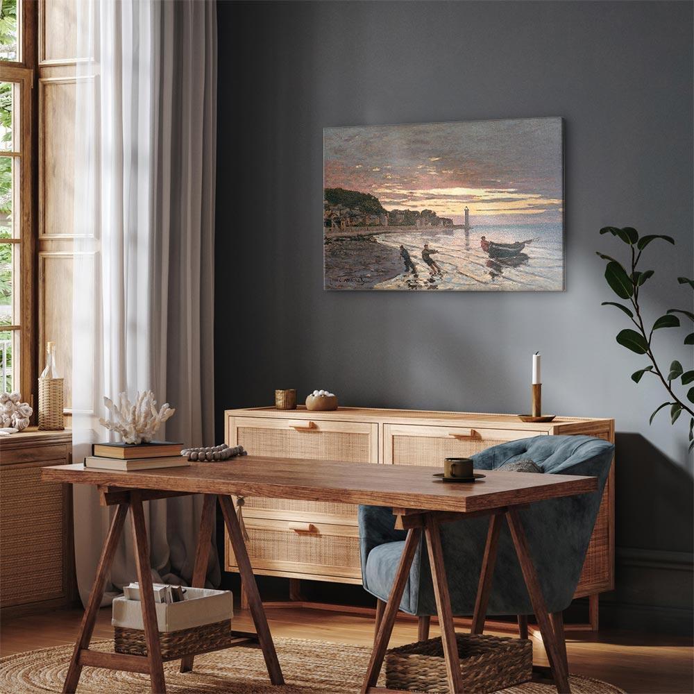 Unsere Bilder sind sicher und geruchsneutral und eignen sich daher ideal für Kinderzimmer. Die Größe wird Ihr Kind sicher beeindrucken! Bilder für Schlafzimmer sind ein echter Blickfang, genauso wie Bilder Wohnzimmer. Dekorieren Sie die Wände in Ihrem privaten Bereich mit einem Bild "Leinwandbild - Claude Monet – Hauling a Boat Ashore, Honfleur". Wir empfehlen Bilder für Schlafzimmer , die Sie beruhigen und in eine erholsame Stimmung versetzen. Bilder aus unserer Kollektion werden Ihrem Interieur eine außergewöhnliche Atmosphäre verleihen. Unabhängig vom Raum schaffen auch Kunst Bilder eine gemütliche Atmosphäre für die Gäste. Massive Holzrahmen unterstreichen den einzigartigen Charakter der Schlafzimmerbilder, und ein schneller und sicherer Versand ist ein weiterer Vorteil, der für diese Wanddekorationen spricht Leinwandbilder sind in fünf Varianten erhältlich, sodass jeder Kunde die perfekte Option für seine Bedürfnisse findet.Die Variante auf Strukturleinwand (Standard) ist eine universelle Dekoration, die das Haushaltsbudget nicht belastet.Für Liebhaber edler Materialien ist ein Druck auf italienischer Leinwand aus 100 % Baumwolle die ideale Wahl.Und für Fans der Malerei? Hier überzeugt die außergewöhnliche Premium-Print-Technik – ein Bild, das auf Strukturleinwand gedruckt und von Hand mit einer Schicht transparenten Gels überzogen wird, die die Pinselstriche eines Künstlers imitiert – ein „wie gemalt“-Effekt, aber zu einem günstigeren Preis.Die Variante im soliden Holzrahmen des Typs American Box mit Tiefeneffekt (zwei Rahmenfarben zur Auswahl, Motiv auf Strukturleinwand gedruckt) bietet eine klassische Lösung in neuer Form.Das Akustikbild (Druck auf Strukturleinwand mit einer zusätzlichen Schicht schallabsorbierendem Schaumstoff) ist dagegen ein Volltreffer für alle, die Ästhetik mit Funktionalität verbinden möchten.Zwar sind die beiden letzten Optionen nur für bestimmte Größen von einteiligen Bildern verfügbar, doch bei allen Varianten legen wir GRATIS die erforderliche Anzahl an Haken und Nägeln zur Montage bei.