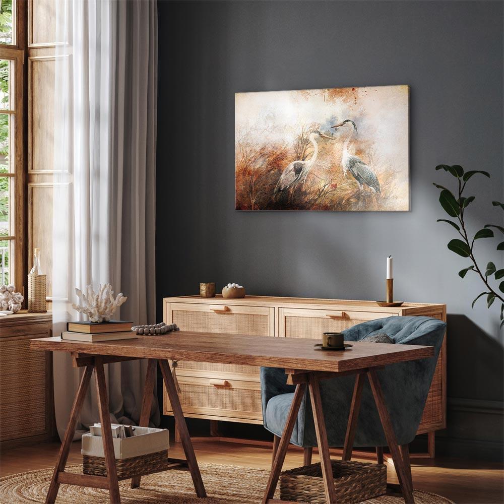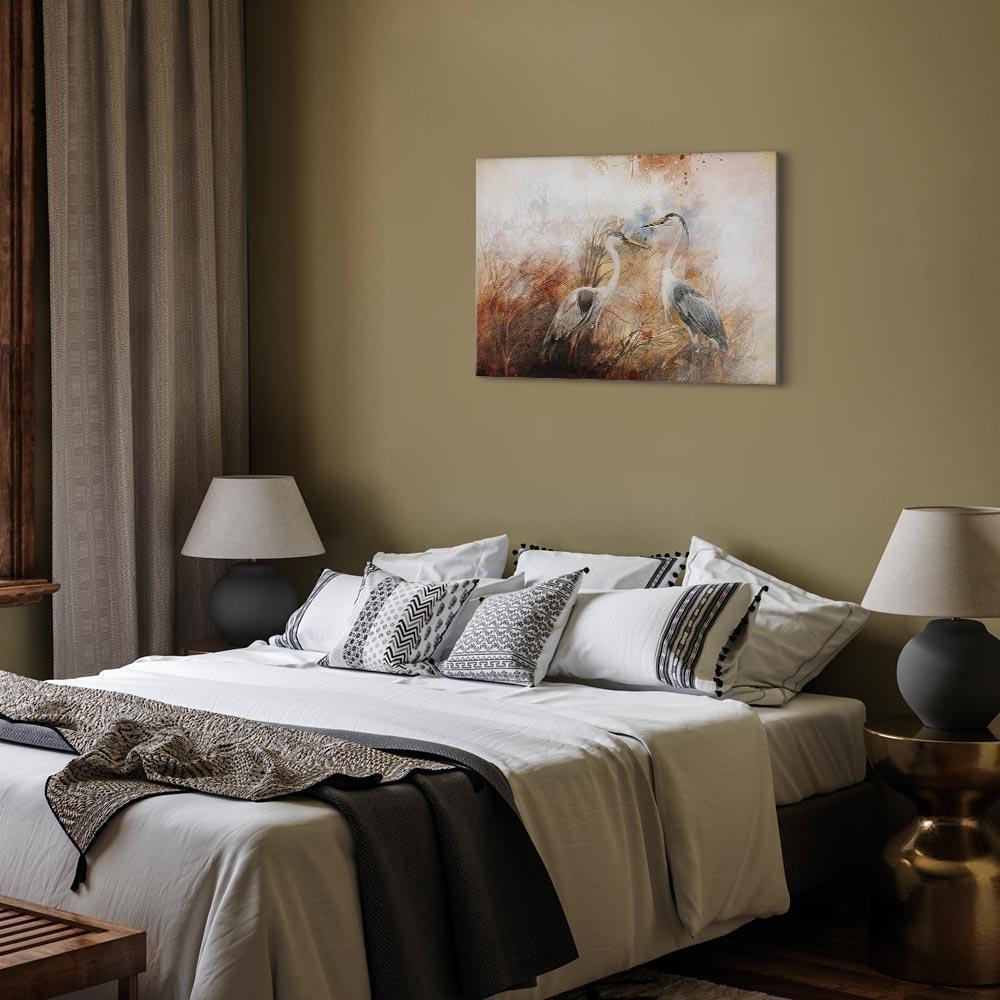Unsere Bilder sind sicher und geruchsneutral und eignen sich daher ideal für Kinderzimmer. Die Größe wird Ihr Kind sicher beeindrucken! Bilder für Schlafzimmer sind ein echter Blickfang, genauso wie Bilder Wohnzimmer. Dekorieren Sie die Wände in Ihrem privaten Bereich mit einem Bild "Leinwandbild - Herons on the Hunt (1 Part) Wide". Wir empfehlen Bilder für Schlafzimmer , die Sie beruhigen und in eine erholsame Stimmung versetzen. Bilder aus unserer Kollektion werden Ihrem Interieur eine außergewöhnliche Atmosphäre verleihen. Unabhängig vom Raum schaffen auch Kunst Bilder eine gemütliche Atmosphäre für die Gäste. Massive Holzrahmen unterstreichen den einzigartigen Charakter der Schlafzimmerbilder, und ein schneller und sicherer Versand ist ein weiterer Vorteil, der für diese Wanddekorationen spricht Leinwandbilder sind in fünf Varianten erhältlich, sodass jeder Kunde die perfekte Option für seine Bedürfnisse findet.Die Variante auf Strukturleinwand (Standard) ist eine universelle Dekoration, die das Haushaltsbudget nicht belastet.Für Liebhaber edler Materialien ist ein Druck auf italienischer Leinwand aus 100 % Baumwolle die ideale Wahl.Und für Fans der Malerei? Hier überzeugt die außergewöhnliche Premium-Print-Technik – ein Bild, das auf Strukturleinwand gedruckt und von Hand mit einer Schicht transparenten Gels überzogen wird, die die Pinselstriche eines Künstlers imitiert – ein „wie gemalt“-Effekt, aber zu einem günstigeren Preis.Die Variante im soliden Holzrahmen des Typs American Box mit Tiefeneffekt (zwei Rahmenfarben zur Auswahl, Motiv auf Strukturleinwand gedruckt) bietet eine klassische Lösung in neuer Form.Das Akustikbild (Druck auf Strukturleinwand mit einer zusätzlichen Schicht schallabsorbierendem Schaumstoff) ist dagegen ein Volltreffer für alle, die Ästhetik mit Funktionalität verbinden möchten.Zwar sind die beiden letzten Optionen nur für bestimmte Größen von einteiligen Bildern verfügbar, doch bei allen Varianten legen wir GRATIS die erforderliche Anzahl an Haken und Nägeln zur Montage bei.