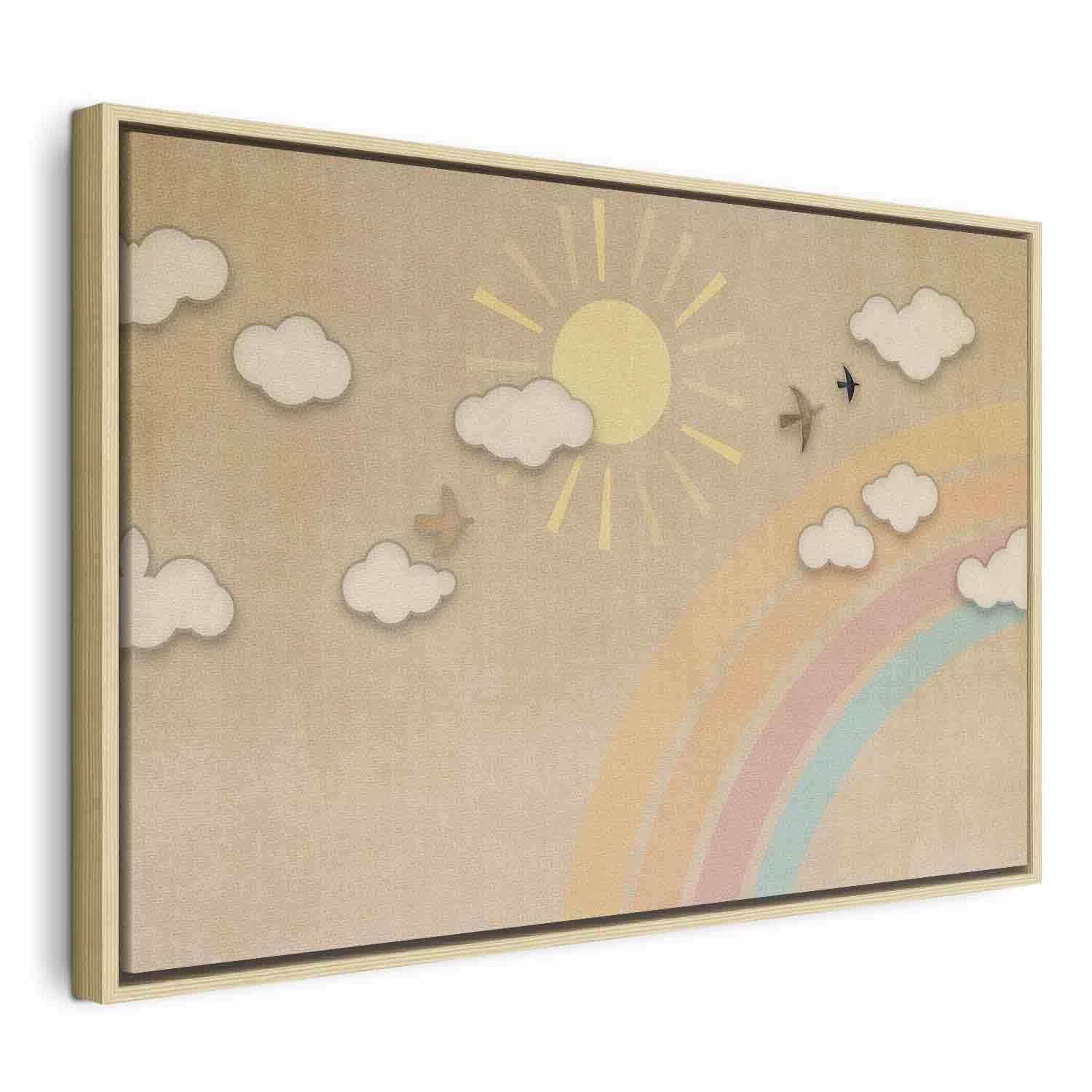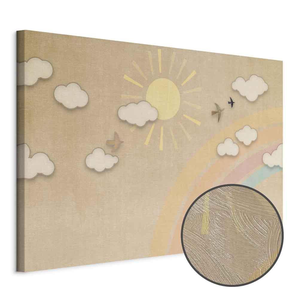 Unsere Bilder sind sicher und geruchsneutral und eignen sich daher ideal für Kinderzimmer. Die Größe wird Ihr Kind sicher beeindrucken! Bilder für Schlafzimmer sind ein echter Blickfang, genauso wie Bilder Wohnzimmer. Dekorieren Sie die Wände in Ihrem privaten Bereich mit einem Bild "Leinwandbild - Holiday Sky - Sunny Day with a Rainbow and Flying Birds". Wir empfehlen Bilder für Schlafzimmer , die Sie beruhigen und in eine erholsame Stimmung versetzen. Bilder aus unserer Kollektion werden Ihrem Interieur eine außergewöhnliche Atmosphäre verleihen. Unabhängig vom Raum schaffen auch Kunst Bilder eine gemütliche Atmosphäre für die Gäste. Massive Holzrahmen unterstreichen den einzigartigen Charakter der Schlafzimmerbilder, und ein schneller und sicherer Versand ist ein weiterer Vorteil, der für diese Wanddekorationen spricht Leinwandbilder sind in fünf Varianten erhältlich, sodass jeder Kunde die perfekte Option für seine Bedürfnisse findet.Die Variante auf Strukturleinwand (Standard) ist eine universelle Dekoration, die das Haushaltsbudget nicht belastet.Für Liebhaber edler Materialien ist ein Druck auf italienischer Leinwand aus 100 % Baumwolle die ideale Wahl.Und für Fans der Malerei? Hier überzeugt die außergewöhnliche Premium-Print-Technik – ein Bild, das auf Strukturleinwand gedruckt und von Hand mit einer Schicht transparenten Gels überzogen wird, die die Pinselstriche eines Künstlers imitiert – ein „wie gemalt“-Effekt, aber zu einem günstigeren Preis.Die Variante im soliden Holzrahmen des Typs American Box mit Tiefeneffekt (zwei Rahmenfarben zur Auswahl, Motiv auf Strukturleinwand gedruckt) bietet eine klassische Lösung in neuer Form.Das Akustikbild (Druck auf Strukturleinwand mit einer zusätzlichen Schicht schallabsorbierendem Schaumstoff) ist dagegen ein Volltreffer für alle, die Ästhetik mit Funktionalität verbinden möchten.Zwar sind die beiden letzten Optionen nur für bestimmte Größen von einteiligen Bildern verfügbar, doch bei allen Varianten legen wir GRATIS die erforderliche Anzahl an Haken und Nägeln zur Montage bei.