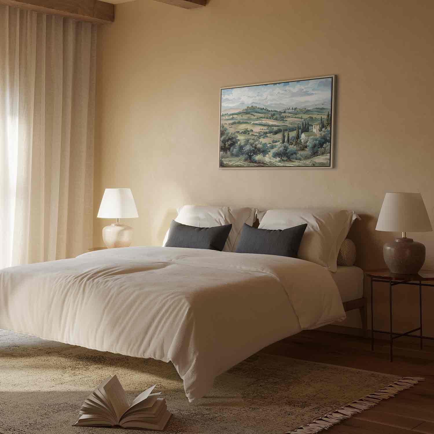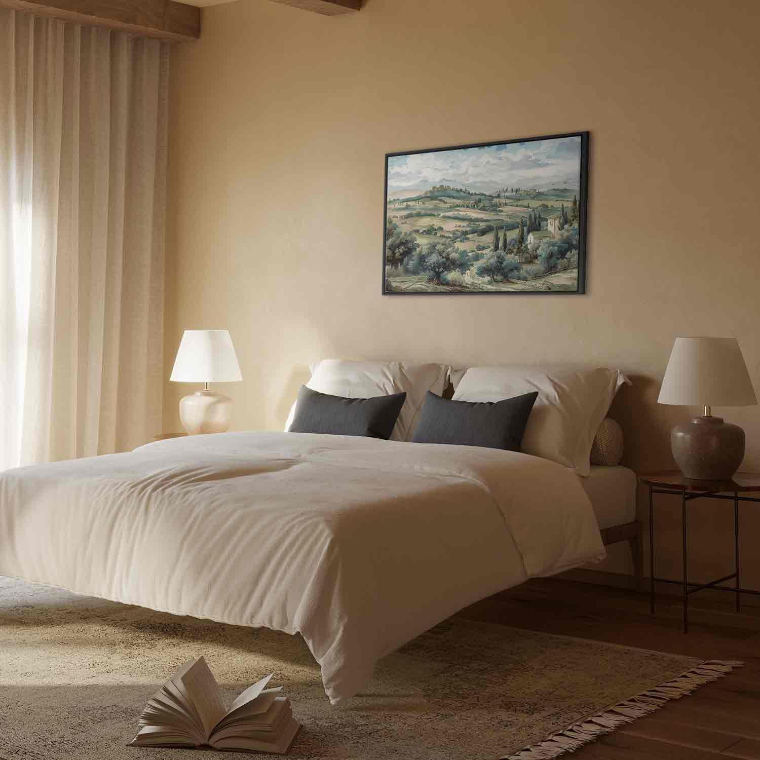 Unsere Bilder sind sicher und geruchsneutral und eignen sich daher ideal für Kinderzimmer. Die Größe wird Ihr Kind sicher beeindrucken! Bilder für Schlafzimmer sind ein echter Blickfang, genauso wie Bilder Wohnzimmer. Dekorieren Sie die Wände in Ihrem privaten Bereich mit einem Bild "Leinwandbild - Landscape with Green Fields and Trees Tuscan Sunny View". Wir empfehlen Bilder für Schlafzimmer , die Sie beruhigen und in eine erholsame Stimmung versetzen. Bilder aus unserer Kollektion werden Ihrem Interieur eine außergewöhnliche Atmosphäre verleihen. Unabhängig vom Raum schaffen auch Kunst Bilder eine gemütliche Atmosphäre für die Gäste. Massive Holzrahmen unterstreichen den einzigartigen Charakter der Schlafzimmerbilder, und ein schneller und sicherer Versand ist ein weiterer Vorteil, der für diese Wanddekorationen spricht Leinwandbilder sind in fünf Varianten erhältlich, sodass jeder Kunde die perfekte Option für seine Bedürfnisse findet.Die Variante auf Strukturleinwand (Standard) ist eine universelle Dekoration, die das Haushaltsbudget nicht belastet.Für Liebhaber edler Materialien ist ein Druck auf italienischer Leinwand aus 100 % Baumwolle die ideale Wahl.Und für Fans der Malerei? Hier überzeugt die außergewöhnliche Premium-Print-Technik – ein Bild, das auf Strukturleinwand gedruckt und von Hand mit einer Schicht transparenten Gels überzogen wird, die die Pinselstriche eines Künstlers imitiert – ein „wie gemalt“-Effekt, aber zu einem günstigeren Preis.Die Variante im soliden Holzrahmen des Typs American Box mit Tiefeneffekt (zwei Rahmenfarben zur Auswahl, Motiv auf Strukturleinwand gedruckt) bietet eine klassische Lösung in neuer Form.Das Akustikbild (Druck auf Strukturleinwand mit einer zusätzlichen Schicht schallabsorbierendem Schaumstoff) ist dagegen ein Volltreffer für alle, die Ästhetik mit Funktionalität verbinden möchten.Zwar sind die beiden letzten Optionen nur für bestimmte Größen von einteiligen Bildern verfügbar, doch bei allen Varianten legen wir GRATIS die erforderliche Anzahl an Haken und Nägeln zur Montage bei.
