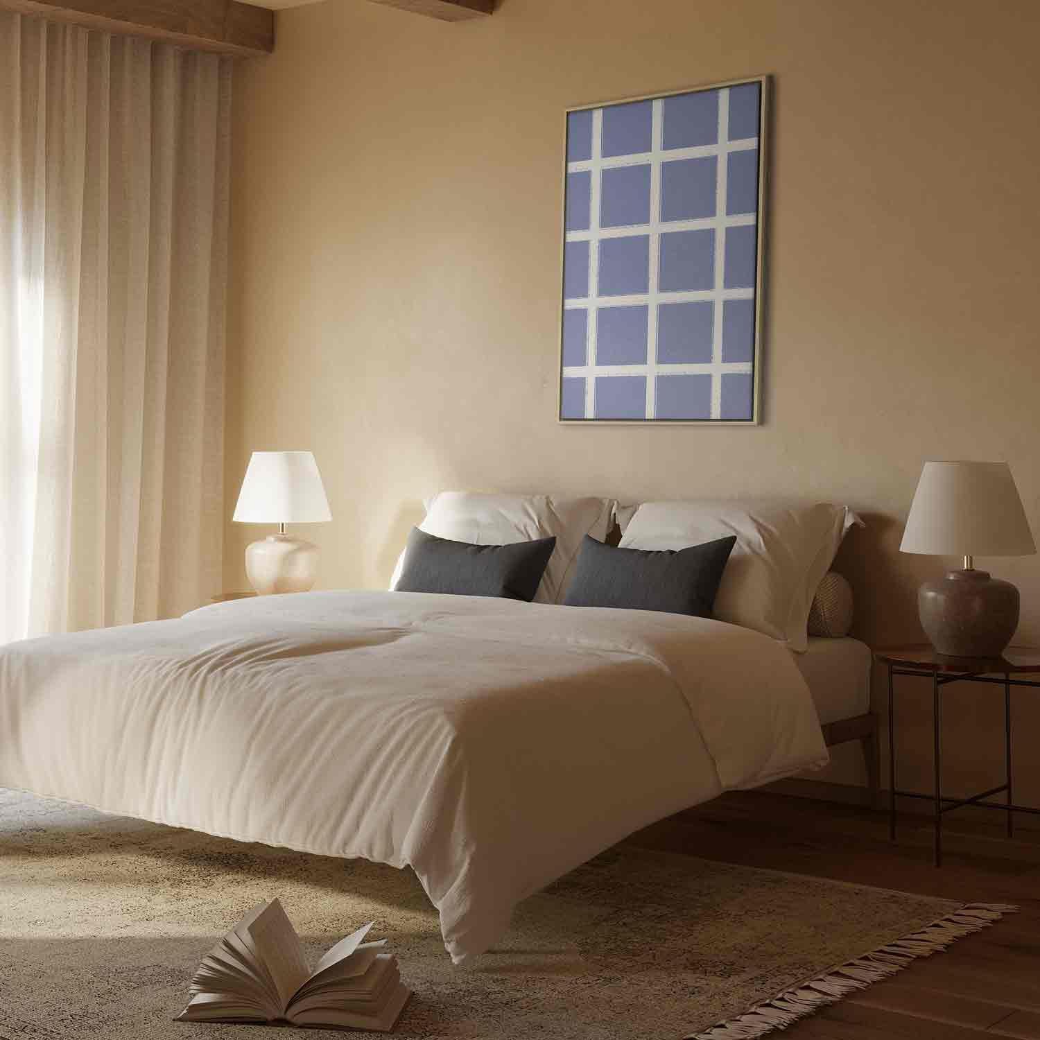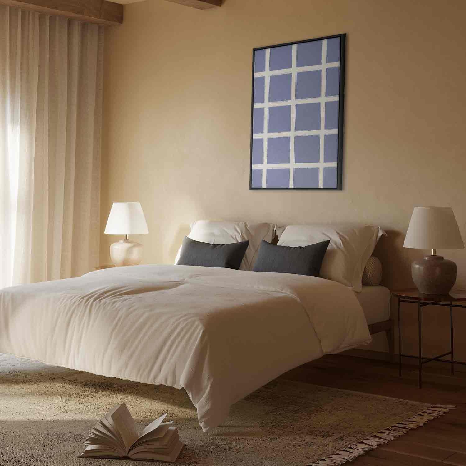 Unsere Bilder sind sicher und geruchsneutral und eignen sich daher ideal für Kinderzimmer. Die Größe wird Ihr Kind sicher beeindrucken! Bilder für Schlafzimmer sind ein echter Blickfang, genauso wie Bilder Wohnzimmer. Dekorieren Sie die Wände in Ihrem privaten Bereich mit einem Bild "Leinwandbild - Lines and Symmetry - Expressive White Grid on a Blue Background". Wir empfehlen Bilder für Schlafzimmer , die Sie beruhigen und in eine erholsame Stimmung versetzen. Bilder aus unserer Kollektion werden Ihrem Interieur eine außergewöhnliche Atmosphäre verleihen. Unabhängig vom Raum schaffen auch Kunst Bilder eine gemütliche Atmosphäre für die Gäste. Massive Holzrahmen unterstreichen den einzigartigen Charakter der Schlafzimmerbilder, und ein schneller und sicherer Versand ist ein weiterer Vorteil, der für diese Wanddekorationen spricht Leinwandbilder sind in fünf Varianten erhältlich, sodass jeder Kunde die perfekte Option für seine Bedürfnisse findet.Die Variante auf Strukturleinwand (Standard) ist eine universelle Dekoration, die das Haushaltsbudget nicht belastet.Für Liebhaber edler Materialien ist ein Druck auf italienischer Leinwand aus 100 % Baumwolle die ideale Wahl.Und für Fans der Malerei? Hier überzeugt die außergewöhnliche Premium-Print-Technik – ein Bild, das auf Strukturleinwand gedruckt und von Hand mit einer Schicht transparenten Gels überzogen wird, die die Pinselstriche eines Künstlers imitiert – ein „wie gemalt“-Effekt, aber zu einem günstigeren Preis.Die Variante im soliden Holzrahmen des Typs American Box mit Tiefeneffekt (zwei Rahmenfarben zur Auswahl, Motiv auf Strukturleinwand gedruckt) bietet eine klassische Lösung in neuer Form.Das Akustikbild (Druck auf Strukturleinwand mit einer zusätzlichen Schicht schallabsorbierendem Schaumstoff) ist dagegen ein Volltreffer für alle, die Ästhetik mit Funktionalität verbinden möchten.Zwar sind die beiden letzten Optionen nur für bestimmte Größen von einteiligen Bildern verfügbar, doch bei allen Varianten legen wir GRATIS die erforderliche Anzahl an Haken und Nägeln zur Montage bei.