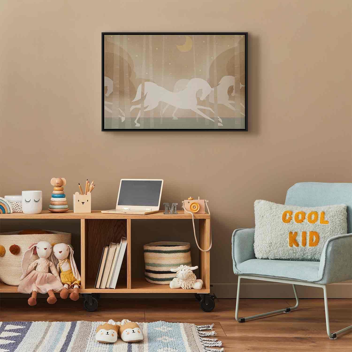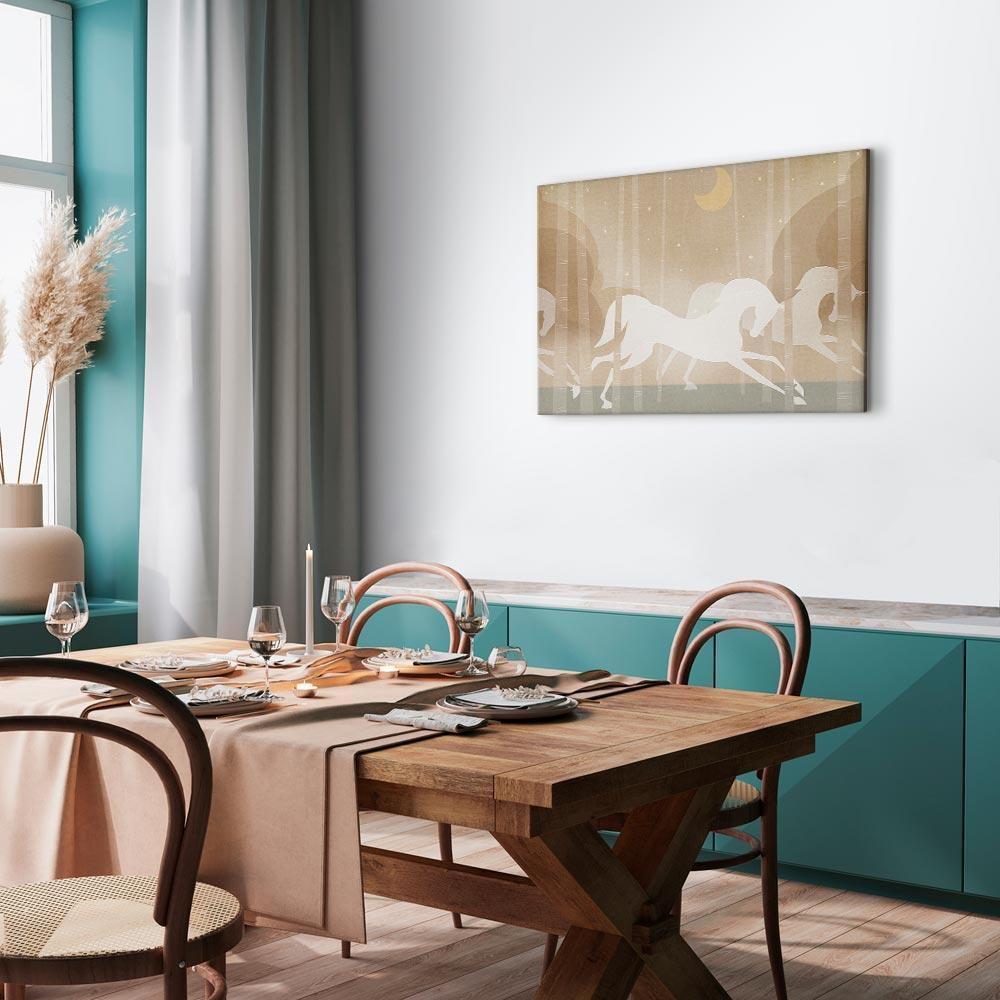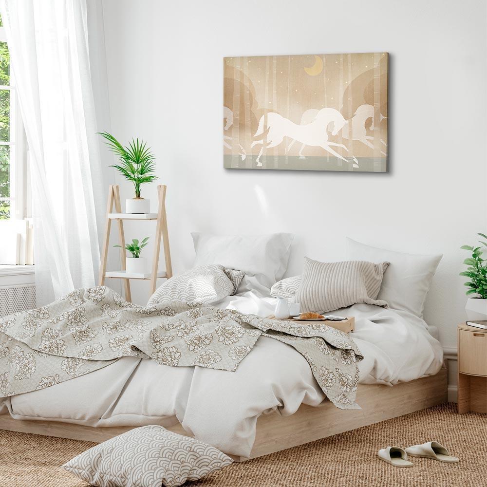 Unsere Bilder sind sicher und geruchsneutral und eignen sich daher ideal für Kinderzimmer. Die Größe wird Ihr Kind sicher beeindrucken! Bilder für Schlafzimmer sind ein echter Blickfang, genauso wie Bilder Wohnzimmer. Dekorieren Sie die Wände in Ihrem privaten Bereich mit einem Bild "Leinwandbild - Moon Horses - Horses Galloping Among Trees on a Starry Night". Wir empfehlen Bilder für Schlafzimmer , die Sie beruhigen und in eine erholsame Stimmung versetzen. Bilder aus unserer Kollektion werden Ihrem Interieur eine außergewöhnliche Atmosphäre verleihen. Unabhängig vom Raum schaffen auch Kunst Bilder eine gemütliche Atmosphäre für die Gäste. Massive Holzrahmen unterstreichen den einzigartigen Charakter der Schlafzimmerbilder, und ein schneller und sicherer Versand ist ein weiterer Vorteil, der für diese Wanddekorationen spricht Leinwandbilder sind in fünf Varianten erhältlich, sodass jeder Kunde die perfekte Option für seine Bedürfnisse findet.Die Variante auf Strukturleinwand (Standard) ist eine universelle Dekoration, die das Haushaltsbudget nicht belastet.Für Liebhaber edler Materialien ist ein Druck auf italienischer Leinwand aus 100 % Baumwolle die ideale Wahl.Und für Fans der Malerei? Hier überzeugt die außergewöhnliche Premium-Print-Technik – ein Bild, das auf Strukturleinwand gedruckt und von Hand mit einer Schicht transparenten Gels überzogen wird, die die Pinselstriche eines Künstlers imitiert – ein „wie gemalt“-Effekt, aber zu einem günstigeren Preis.Die Variante im soliden Holzrahmen des Typs American Box mit Tiefeneffekt (zwei Rahmenfarben zur Auswahl, Motiv auf Strukturleinwand gedruckt) bietet eine klassische Lösung in neuer Form.Das Akustikbild (Druck auf Strukturleinwand mit einer zusätzlichen Schicht schallabsorbierendem Schaumstoff) ist dagegen ein Volltreffer für alle, die Ästhetik mit Funktionalität verbinden möchten.Zwar sind die beiden letzten Optionen nur für bestimmte Größen von einteiligen Bildern verfügbar, doch bei allen Varianten legen wir GRATIS die erforderliche Anzahl an Haken und Nägeln zur Montage bei.
