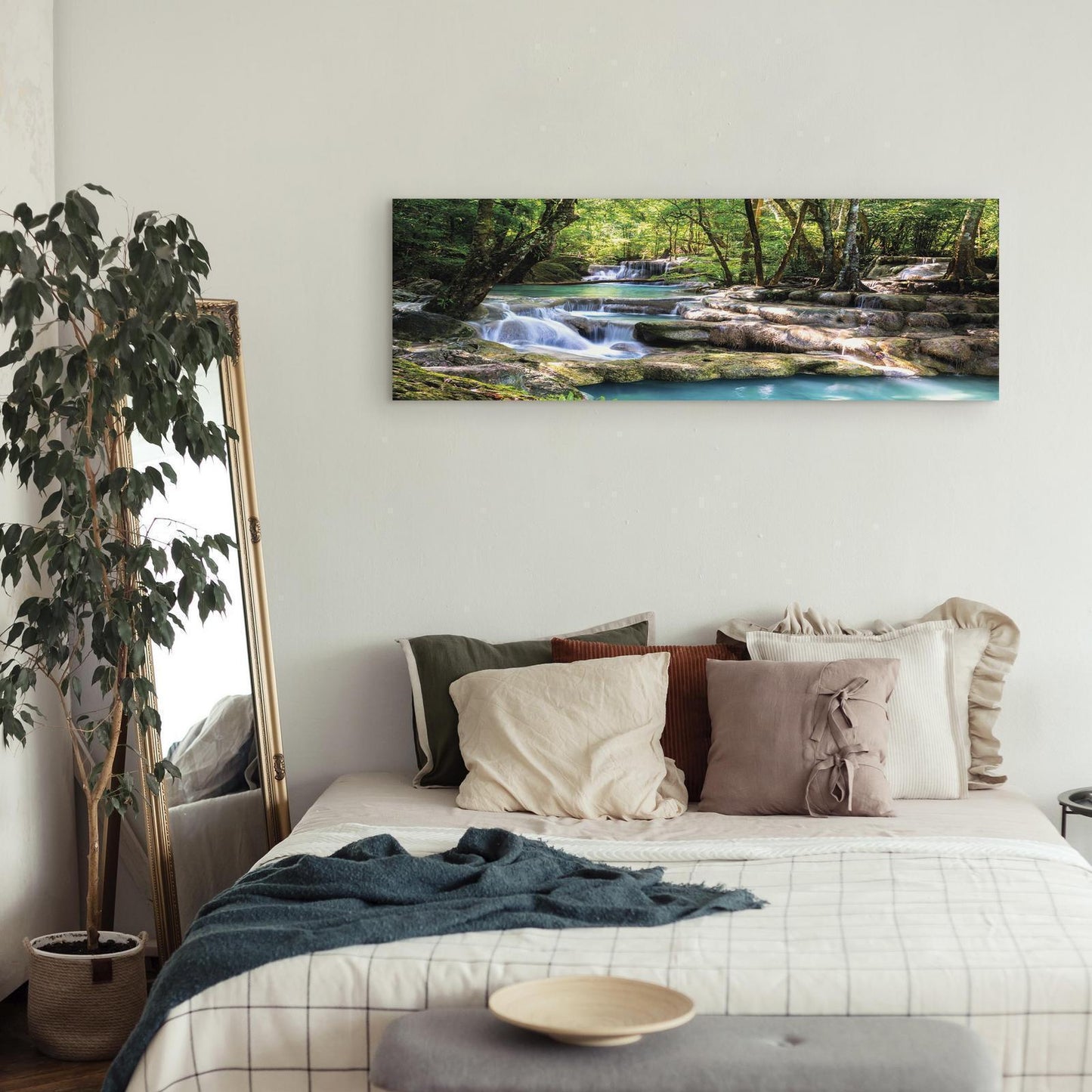Unsere Bilder sind sicher und geruchsneutral und eignen sich daher ideal für Kinderzimmer. Die Größe wird Ihr Kind sicher beeindrucken! Bilder für Schlafzimmer sind ein echter Blickfang, genauso wie Bilder Wohnzimmer. Dekorieren Sie die Wände in Ihrem privaten Bereich mit einem Bild "Leinwandbild - Nature: Forest Waterfall". Wir empfehlen Bilder für Schlafzimmer, die Sie beruhigen und in eine erholsame Stimmung versetzen. Bilder aus unserer Kollektion werden Ihrem Interieur eine außergewöhnliche Atmosphäre verleihen. Unabhängig vom Raum schaffen auch Kunst Bilder eine gemütliche Atmosphäre für die Gäste. Massive Holzrahmen unterstreichen den einzigartigen Charakter der Schlafzimmerbilder, und ein schneller und sicherer Versand ist ein weiterer Vorteil, der für diese Wanddekorationen spricht. Bilder auf Leinwand sind in vier Versionen erhältlich, aus denen jeder Kunde die perfekte Option für seine Bedürfnisse finden wird. Das Angebot umfasst eine Version auf Vliesleinwand (Standard), auf italienischer Leinwand, Premium Print (ein Bild, das auf italienischer Leinwand gedruckt und von Hand mit einer Schicht transparentem Gel überzogen ist, das die Pinselstriche des Künstlers imitiert) sowie in einem soliden, hölzernen American-Box-Rahmen (zwei Rahmenfarben zur Auswahl, Muster gedruckt auf italienischer Leinwand).