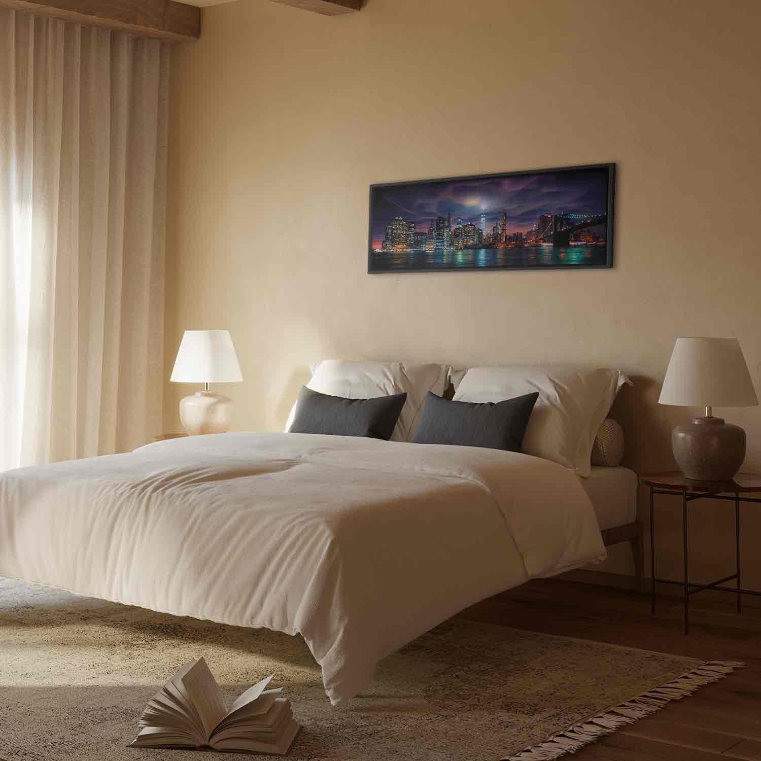 Unsere Bilder sind sicher und geruchsneutral und eignen sich daher ideal für Kinderzimmer. Die Größe wird Ihr Kind sicher beeindrucken! Bilder für Schlafzimmer sind ein echter Blickfang, genauso wie Bilder Wohnzimmer. Dekorieren Sie die Wände in Ihrem privaten Bereich mit einem Bild "Leinwandbild - New York: Dark City". Wir empfehlen Bilder für Schlafzimmer , die Sie beruhigen und in eine erholsame Stimmung versetzen. Bilder aus unserer Kollektion werden Ihrem Interieur eine außergewöhnliche Atmosphäre verleihen. Unabhängig vom Raum schaffen auch Kunst Bilder eine gemütliche Atmosphäre für die Gäste. Massive Holzrahmen unterstreichen den einzigartigen Charakter der Schlafzimmerbilder, und ein schneller und sicherer Versand ist ein weiterer Vorteil, der für diese Wanddekorationen spricht Leinwandbilder sind in fünf Varianten erhältlich, sodass jeder Kunde die perfekte Option für seine Bedürfnisse findet.Die Variante auf Strukturleinwand (Standard) ist eine universelle Dekoration, die das Haushaltsbudget nicht belastet.Für Liebhaber edler Materialien ist ein Druck auf italienischer Leinwand aus 100 % Baumwolle die ideale Wahl.Und für Fans der Malerei? Hier überzeugt die außergewöhnliche Premium-Print-Technik – ein Bild, das auf Strukturleinwand gedruckt und von Hand mit einer Schicht transparenten Gels überzogen wird, die die Pinselstriche eines Künstlers imitiert – ein „wie gemalt“-Effekt, aber zu einem günstigeren Preis.Die Variante im soliden Holzrahmen des Typs American Box mit Tiefeneffekt (zwei Rahmenfarben zur Auswahl, Motiv auf Strukturleinwand gedruckt) bietet eine klassische Lösung in neuer Form.Das Akustikbild (Druck auf Strukturleinwand mit einer zusätzlichen Schicht schallabsorbierendem Schaumstoff) ist dagegen ein Volltreffer für alle, die Ästhetik mit Funktionalität verbinden möchten.Zwar sind die beiden letzten Optionen nur für bestimmte Größen von einteiligen Bildern verfügbar, doch bei allen Varianten legen wir GRATIS die erforderliche Anzahl an Haken und Nägeln zur Montage bei.