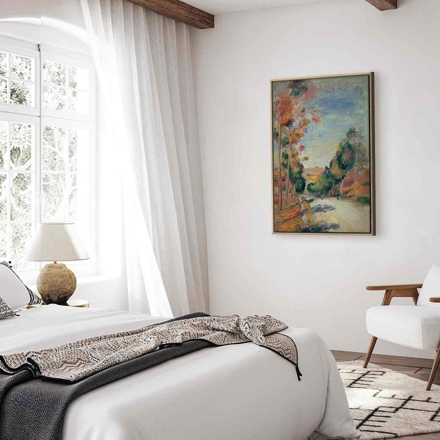 Unsere Bilder sind sicher und geruchsneutral und eignen sich daher ideal für Kinderzimmer. Die Größe wird Ihr Kind sicher beeindrucken! Bilder für Schlafzimmer sind ein echter Blickfang, genauso wie Bilder Wohnzimmer. Dekorieren Sie die Wände in Ihrem privaten Bereich mit einem Bild "Leinwandbild - Paysage d'Essoyes (Pierre-Auguste Renoir)". Wir empfehlen Bilder für Schlafzimmer, die Sie beruhigen und in eine erholsame Stimmung versetzen. Bilder aus unserer Kollektion werden Ihrem Interieur eine außergewöhnliche Atmosphäre verleihen. Unabhängig vom Raum schaffen auch Kunst Bilder eine gemütliche Atmosphäre für die Gäste. Massive Holzrahmen unterstreichen den einzigartigen Charakter der Schlafzimmerbilder, und ein schneller und sicherer Versand ist ein weiterer Vorteil, der für diese Wanddekorationen spricht. Bilder auf Leinwand sind in vier Versionen erhältlich, aus denen jeder Kunde die perfekte Option für seine Bedürfnisse finden wird. Das Angebot umfasst eine Version auf Vliesleinwand (Standard), auf italienischer Leinwand, Premium Print (ein Bild, das auf italienischer Leinwand gedruckt und von Hand mit einer Schicht transparentem Gel überzogen ist, das die Pinselstriche des Künstlers imitiert) sowie in einem soliden, hölzernen American-Box-Rahmen (zwei Rahmenfarben zur Auswahl, Muster gedruckt auf italienischer Leinwand).