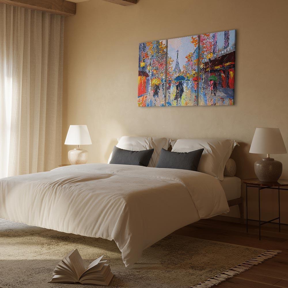 Unsere Bilder sind sicher und geruchsneutral und eignen sich daher ideal für Kinderzimmer. Die Größe wird Ihr Kind sicher beeindrucken! Bilder für Schlafzimmer sind ein echter Blickfang, genauso wie Bilder Wohnzimmer. Dekorieren Sie die Wände in Ihrem privaten Bereich mit einem Bild "Leinwandbild - Rainy Paris". Wir empfehlen Bilder für Schlafzimmer , die Sie beruhigen und in eine erholsame Stimmung versetzen. Bilder aus unserer Kollektion werden Ihrem Interieur eine außergewöhnliche Atmosphäre verleihen. Unabhängig vom Raum schaffen auch Kunst Bilder eine gemütliche Atmosphäre für die Gäste. Massive Holzrahmen unterstreichen den einzigartigen Charakter der Schlafzimmerbilder, und ein schneller und sicherer Versand ist ein weiterer Vorteil, der für diese Wanddekorationen spricht Leinwandbilder sind in fünf Varianten erhältlich, sodass jeder Kunde die perfekte Option für seine Bedürfnisse findet.Die Variante auf Strukturleinwand (Standard) ist eine universelle Dekoration, die das Haushaltsbudget nicht belastet.Für Liebhaber edler Materialien ist ein Druck auf italienischer Leinwand aus 100 % Baumwolle die ideale Wahl.Und für Fans der Malerei? Hier überzeugt die außergewöhnliche Premium-Print-Technik – ein Bild, das auf Strukturleinwand gedruckt und von Hand mit einer Schicht transparenten Gels überzogen wird, die die Pinselstriche eines Künstlers imitiert – ein „wie gemalt“-Effekt, aber zu einem günstigeren Preis.Die Variante im soliden Holzrahmen des Typs American Box mit Tiefeneffekt (zwei Rahmenfarben zur Auswahl, Motiv auf Strukturleinwand gedruckt) bietet eine klassische Lösung in neuer Form.Das Akustikbild (Druck auf Strukturleinwand mit einer zusätzlichen Schicht schallabsorbierendem Schaumstoff) ist dagegen ein Volltreffer für alle, die Ästhetik mit Funktionalität verbinden möchten.Zwar sind die beiden letzten Optionen nur für bestimmte Größen von einteiligen Bildern verfügbar, doch bei allen Varianten legen wir GRATIS die erforderliche Anzahl an Haken und Nägeln zur Montage bei.