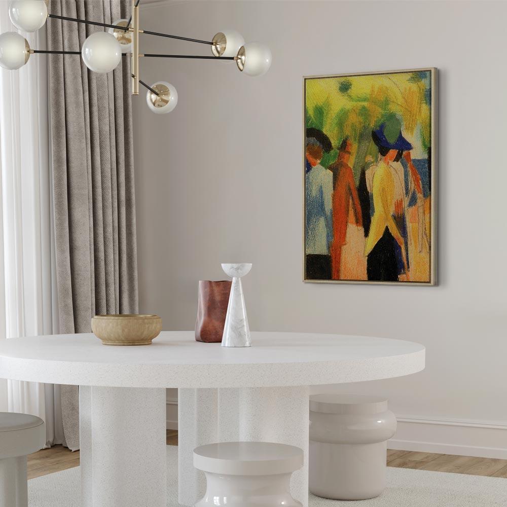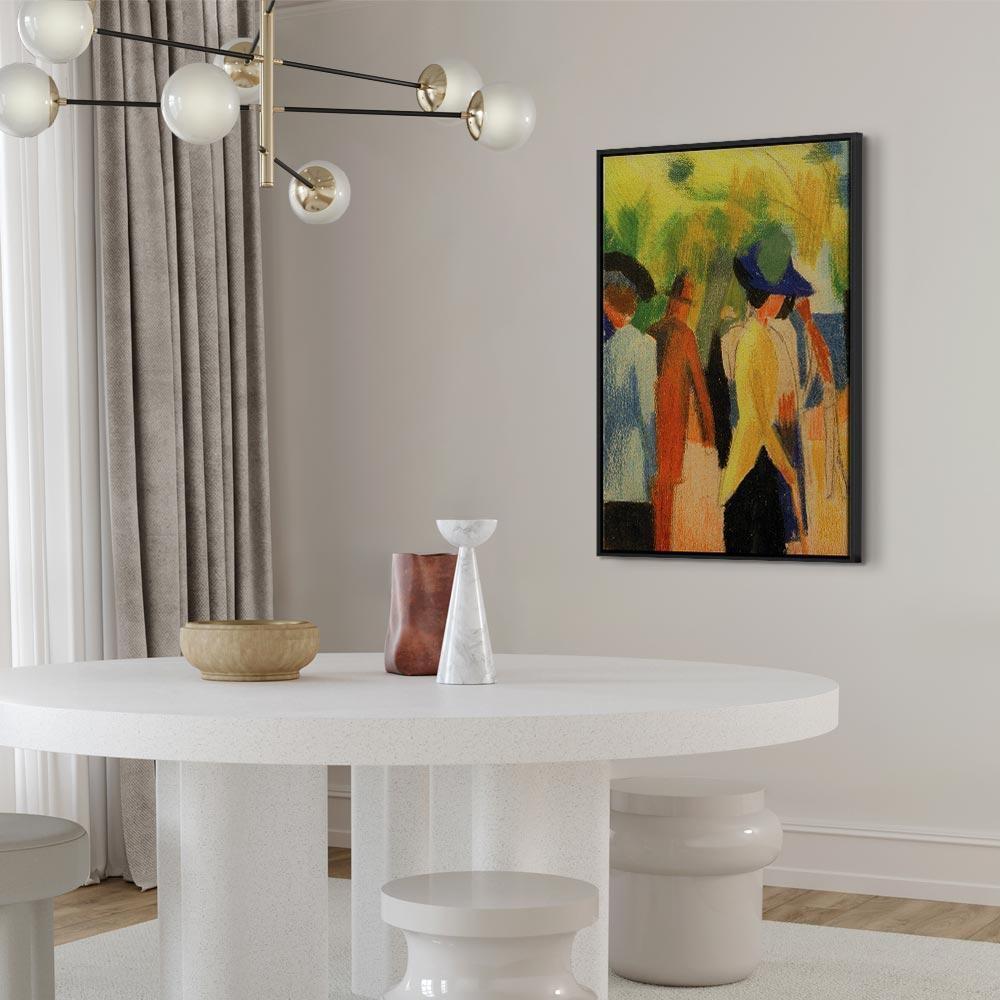 Unsere Bilder sind sicher und geruchsneutral und eignen sich daher ideal für Kinderzimmer. Die Größe wird Ihr Kind sicher beeindrucken! Bilder für Schlafzimmer sind ein echter Blickfang, genauso wie Bilder Wohnzimmer. Dekorieren Sie die Wände in Ihrem privaten Bereich mit einem Bild "Leinwandbild - August Macke – Walker under trees (Walker in the park)". Wir empfehlen Bilder für Schlafzimmer , die Sie beruhigen und in eine erholsame Stimmung versetzen. Bilder aus unserer Kollektion werden Ihrem Interieur eine außergewöhnliche Atmosphäre verleihen. Unabhängig vom Raum schaffen auch Kunst Bilder eine gemütliche Atmosphäre für die Gäste. Massive Holzrahmen unterstreichen den einzigartigen Charakter der Schlafzimmerbilder, und ein schneller und sicherer Versand ist ein weiterer Vorteil, der für diese Wanddekorationen spricht Leinwandbilder sind in fünf Varianten erhältlich, sodass jeder Kunde die perfekte Option für seine Bedürfnisse findet.Die Variante auf Strukturleinwand (Standard) ist eine universelle Dekoration, die das Haushaltsbudget nicht belastet.Für Liebhaber edler Materialien ist ein Druck auf italienischer Leinwand aus 100 % Baumwolle die ideale Wahl.Und für Fans der Malerei? Hier überzeugt die außergewöhnliche Premium-Print-Technik – ein Bild, das auf Strukturleinwand gedruckt und von Hand mit einer Schicht transparenten Gels überzogen wird, die die Pinselstriche eines Künstlers imitiert – ein „wie gemalt“-Effekt, aber zu einem günstigeren Preis.Die Variante im soliden Holzrahmen des Typs American Box mit Tiefeneffekt (zwei Rahmenfarben zur Auswahl, Motiv auf Strukturleinwand gedruckt) bietet eine klassische Lösung in neuer Form.Das Akustikbild (Druck auf Strukturleinwand mit einer zusätzlichen Schicht schallabsorbierendem Schaumstoff) ist dagegen ein Volltreffer für alle, die Ästhetik mit Funktionalität verbinden möchten.Zwar sind die beiden letzten Optionen nur für bestimmte Größen von einteiligen Bildern verfügbar, doch bei allen Varianten legen wir GRATIS die erforderliche Anzahl an Haken und Nägeln zur Montage bei.