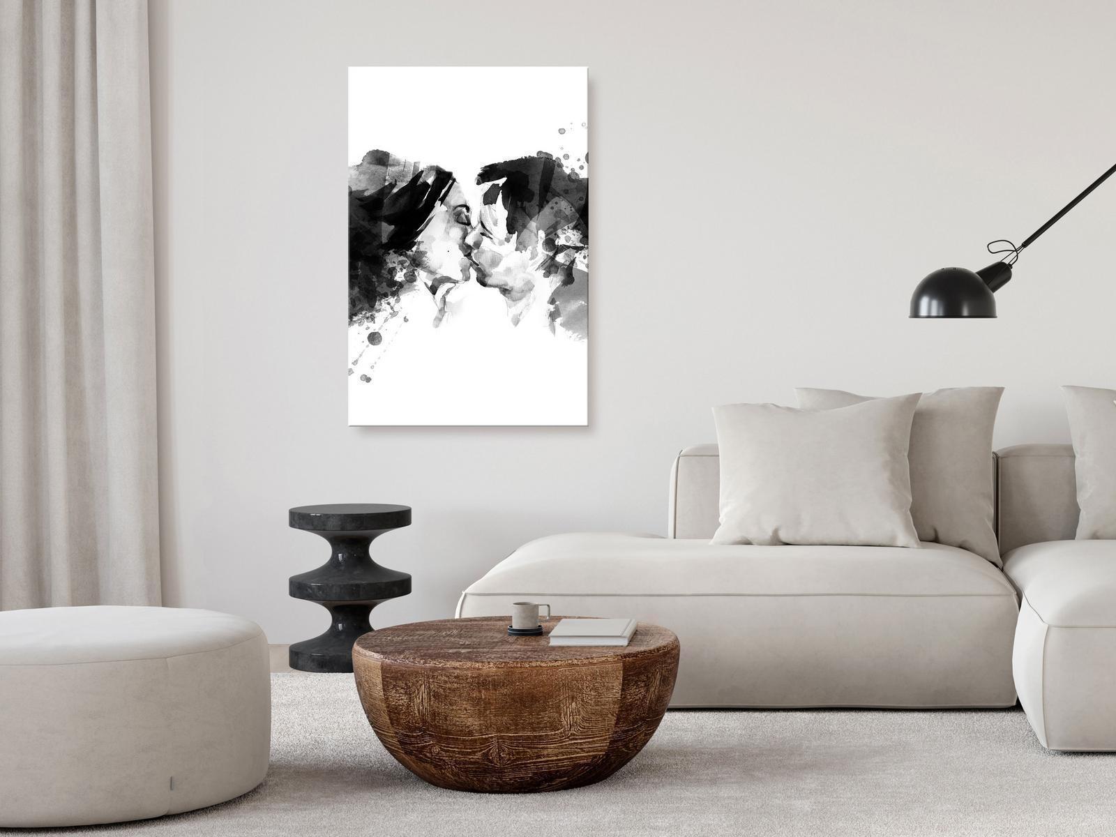 Ein Moment voller Emotionen: Dieses Leinwandbild im Hochformat fängt die flüchtige Schönheit eines spontanen Kusses in einer urbanen Umgebung ein. Der kontrastreiche Stil mit Grautönen, Weiß und Schwarz erinnert an Streetart und moderne Popkultur.