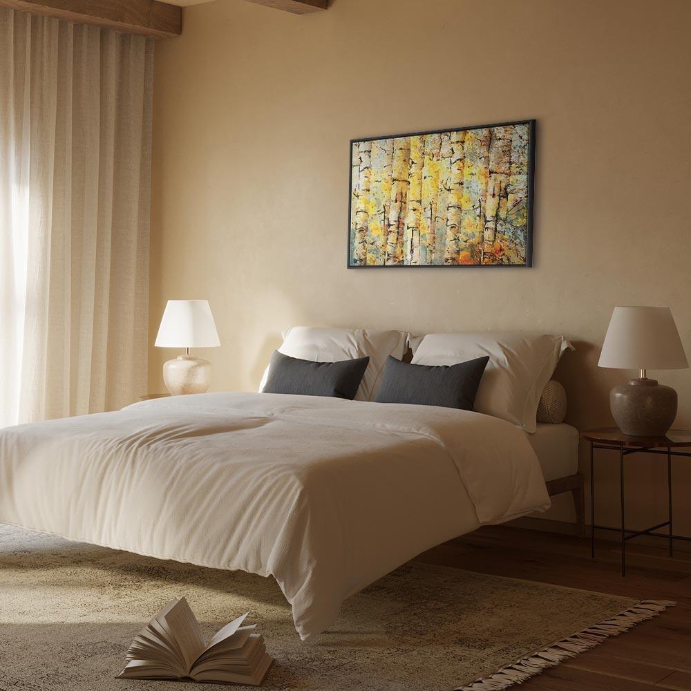 Unsere Bilder sind sicher und geruchsneutral und eignen sich daher ideal für Kinderzimmer. Die Größe wird Ihr Kind sicher beeindrucken! Bilder für Schlafzimmer sind ein echter Blickfang, genauso wie Bilder Wohnzimmer. Dekorieren Sie die Wände in Ihrem privaten Bereich mit einem Bild "Leinwandbild - Summer Colors of the Forest (1 Part) Wide". Wir empfehlen Bilder für Schlafzimmer , die Sie beruhigen und in eine erholsame Stimmung versetzen. Bilder aus unserer Kollektion werden Ihrem Interieur eine außergewöhnliche Atmosphäre verleihen. Unabhängig vom Raum schaffen auch Kunst Bilder eine gemütliche Atmosphäre für die Gäste. Massive Holzrahmen unterstreichen den einzigartigen Charakter der Schlafzimmerbilder, und ein schneller und sicherer Versand ist ein weiterer Vorteil, der für diese Wanddekorationen spricht Leinwandbilder sind in fünf Varianten erhältlich, sodass jeder Kunde die perfekte Option für seine Bedürfnisse findet.Die Variante auf Strukturleinwand (Standard) ist eine universelle Dekoration, die das Haushaltsbudget nicht belastet.Für Liebhaber edler Materialien ist ein Druck auf italienischer Leinwand aus 100 % Baumwolle die ideale Wahl.Und für Fans der Malerei? Hier überzeugt die außergewöhnliche Premium-Print-Technik – ein Bild, das auf Strukturleinwand gedruckt und von Hand mit einer Schicht transparenten Gels überzogen wird, die die Pinselstriche eines Künstlers imitiert – ein „wie gemalt“-Effekt, aber zu einem günstigeren Preis.Die Variante im soliden Holzrahmen des Typs American Box mit Tiefeneffekt (zwei Rahmenfarben zur Auswahl, Motiv auf Strukturleinwand gedruckt) bietet eine klassische Lösung in neuer Form.Das Akustikbild (Druck auf Strukturleinwand mit einer zusätzlichen Schicht schallabsorbierendem Schaumstoff) ist dagegen ein Volltreffer für alle, die Ästhetik mit Funktionalität verbinden möchten.Zwar sind die beiden letzten Optionen nur für bestimmte Größen von einteiligen Bildern verfügbar, doch bei allen Varianten legen wir GRATIS die erforderliche Anzahl an Haken und Nägeln zur Montage bei.