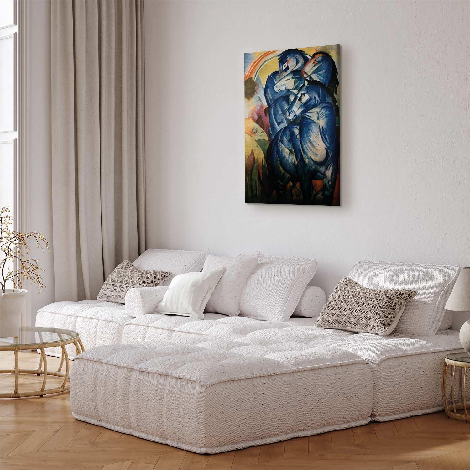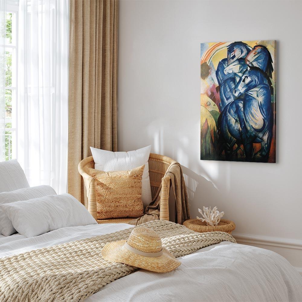 Unsere Bilder sind sicher und geruchsneutral und eignen sich daher ideal für Kinderzimmer. Die Größe wird Ihr Kind sicher beeindrucken! Bilder für Schlafzimmer sind ein echter Blickfang, genauso wie Bilder Wohnzimmer. Dekorieren Sie die Wände in Ihrem privaten Bereich mit einem Bild "Leinwandbild - Franz Marc – The tower of blue horses". Wir empfehlen Bilder für Schlafzimmer , die Sie beruhigen und in eine erholsame Stimmung versetzen. Bilder aus unserer Kollektion werden Ihrem Interieur eine außergewöhnliche Atmosphäre verleihen. Unabhängig vom Raum schaffen auch Kunst Bilder eine gemütliche Atmosphäre für die Gäste. Massive Holzrahmen unterstreichen den einzigartigen Charakter der Schlafzimmerbilder, und ein schneller und sicherer Versand ist ein weiterer Vorteil, der für diese Wanddekorationen spricht Leinwandbilder sind in fünf Varianten erhältlich, sodass jeder Kunde die perfekte Option für seine Bedürfnisse findet.Die Variante auf Strukturleinwand (Standard) ist eine universelle Dekoration, die das Haushaltsbudget nicht belastet.Für Liebhaber edler Materialien ist ein Druck auf italienischer Leinwand aus 100 % Baumwolle die ideale Wahl.Und für Fans der Malerei? Hier überzeugt die außergewöhnliche Premium-Print-Technik – ein Bild, das auf Strukturleinwand gedruckt und von Hand mit einer Schicht transparenten Gels überzogen wird, die die Pinselstriche eines Künstlers imitiert – ein „wie gemalt“-Effekt, aber zu einem günstigeren Preis.Die Variante im soliden Holzrahmen des Typs American Box mit Tiefeneffekt (zwei Rahmenfarben zur Auswahl, Motiv auf Strukturleinwand gedruckt) bietet eine klassische Lösung in neuer Form.Das Akustikbild (Druck auf Strukturleinwand mit einer zusätzlichen Schicht schallabsorbierendem Schaumstoff) ist dagegen ein Volltreffer für alle, die Ästhetik mit Funktionalität verbinden möchten.Zwar sind die beiden letzten Optionen nur für bestimmte Größen von einteiligen Bildern verfügbar, doch bei allen Varianten legen wir GRATIS die erforderliche Anzahl an Haken und Nägeln zur Montage bei.