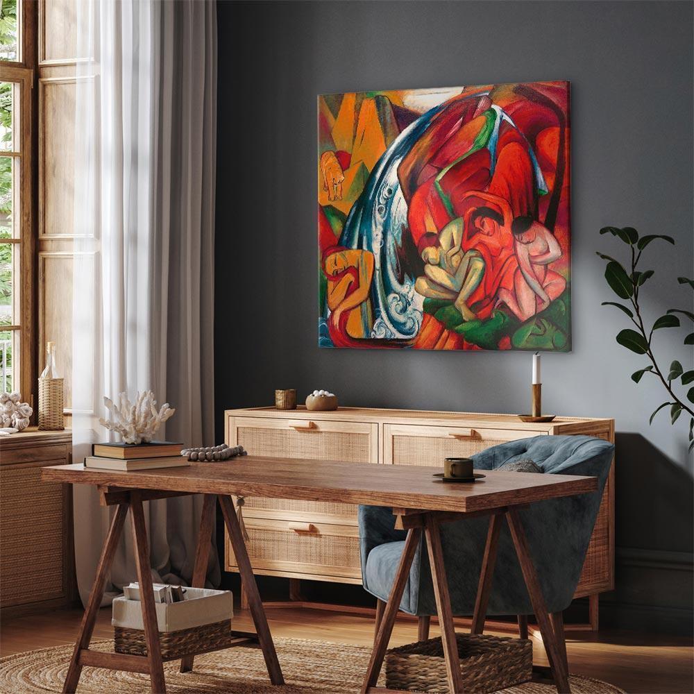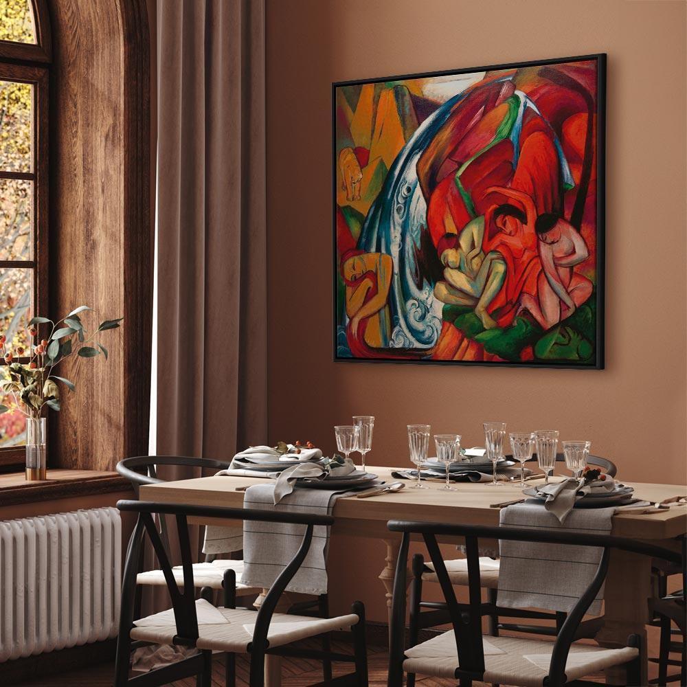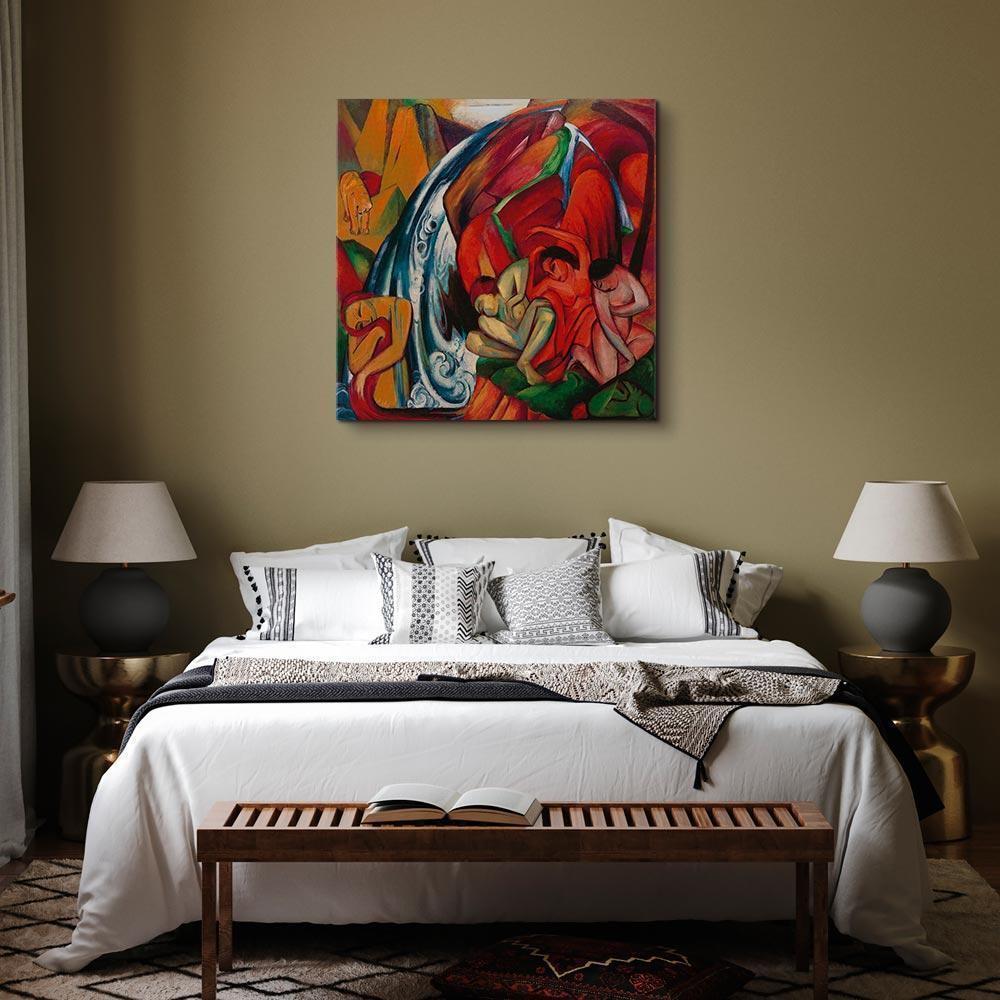 Unsere Bilder sind sicher und geruchsneutral und eignen sich daher ideal für Kinderzimmer. Die Größe wird Ihr Kind sicher beeindrucken! Bilder für Schlafzimmer sind ein echter Blickfang, genauso wie Bilder Wohnzimmer. Dekorieren Sie die Wände in Ihrem privaten Bereich mit einem Bild "Leinwandbild - Franz Marc – The waterfall (Women under a waterfall)". Wir empfehlen Bilder für Schlafzimmer , die Sie beruhigen und in eine erholsame Stimmung versetzen. Bilder aus unserer Kollektion werden Ihrem Interieur eine außergewöhnliche Atmosphäre verleihen. Unabhängig vom Raum schaffen auch Kunst Bilder eine gemütliche Atmosphäre für die Gäste. Massive Holzrahmen unterstreichen den einzigartigen Charakter der Schlafzimmerbilder, und ein schneller und sicherer Versand ist ein weiterer Vorteil, der für diese Wanddekorationen spricht Leinwandbilder sind in fünf Varianten erhältlich, sodass jeder Kunde die perfekte Option für seine Bedürfnisse findet.Die Variante auf Strukturleinwand (Standard) ist eine universelle Dekoration, die das Haushaltsbudget nicht belastet.Für Liebhaber edler Materialien ist ein Druck auf italienischer Leinwand aus 100 % Baumwolle die ideale Wahl.Und für Fans der Malerei? Hier überzeugt die außergewöhnliche Premium-Print-Technik – ein Bild, das auf Strukturleinwand gedruckt und von Hand mit einer Schicht transparenten Gels überzogen wird, die die Pinselstriche eines Künstlers imitiert – ein „wie gemalt“-Effekt, aber zu einem günstigeren Preis.Die Variante im soliden Holzrahmen des Typs American Box mit Tiefeneffekt (zwei Rahmenfarben zur Auswahl, Motiv auf Strukturleinwand gedruckt) bietet eine klassische Lösung in neuer Form.Das Akustikbild (Druck auf Strukturleinwand mit einer zusätzlichen Schicht schallabsorbierendem Schaumstoff) ist dagegen ein Volltreffer für alle, die Ästhetik mit Funktionalität verbinden möchten.Zwar sind die beiden letzten Optionen nur für bestimmte Größen von einteiligen Bildern verfügbar, doch bei allen Varianten legen wir GRATIS die erforderliche Anzahl an Haken und Nägeln zur Montage bei.