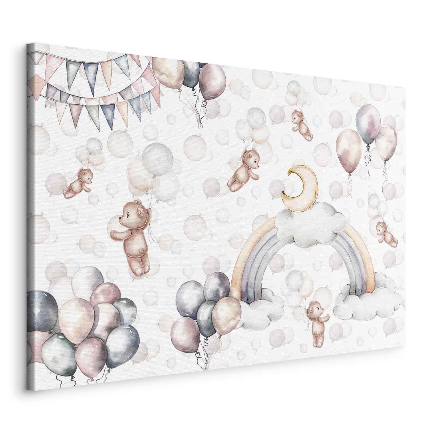 Leinwandbild - Toy Bears with Balloons - Flying Plush Bears Among Balloons Clouds and Rainbows in Subtle Pastel Hues