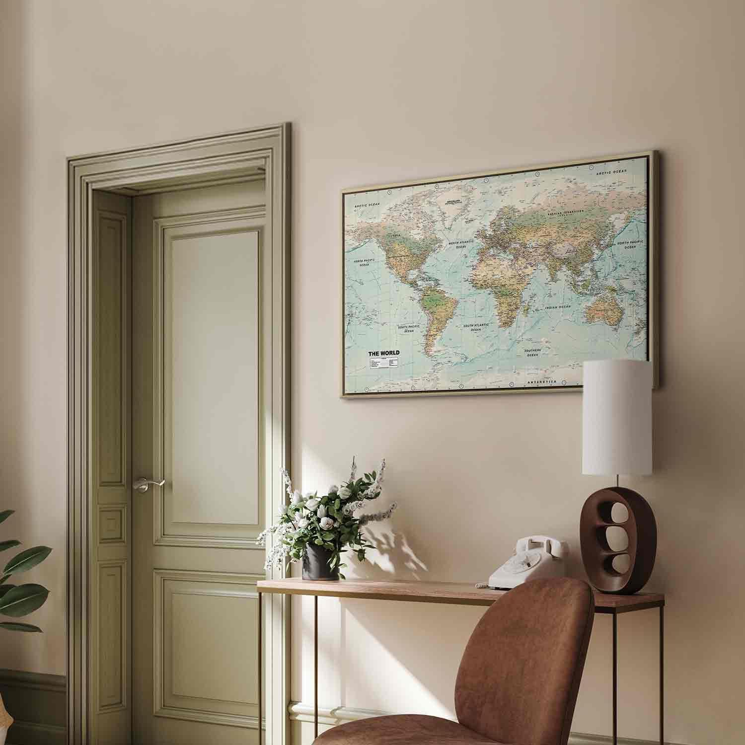 Unsere Bilder sind sicher und geruchsneutral und eignen sich daher ideal für Kinderzimmer. Die Größe wird Ihr Kind sicher beeindrucken! Bilder für Schlafzimmer sind ein echter Blickfang, genauso wie Bilder Wohnzimmer. Dekorieren Sie die Wände in Ihrem privaten Bereich mit einem Bild "Leinwandbild - World Map: Beautiful World". Wir empfehlen Bilder für Schlafzimmer , die Sie beruhigen und in eine erholsame Stimmung versetzen. Bilder aus unserer Kollektion werden Ihrem Interieur eine außergewöhnliche Atmosphäre verleihen. Unabhängig vom Raum schaffen auch Kunst Bilder eine gemütliche Atmosphäre für die Gäste. Massive Holzrahmen unterstreichen den einzigartigen Charakter der Schlafzimmerbilder, und ein schneller und sicherer Versand ist ein weiterer Vorteil, der für diese Wanddekorationen spricht Leinwandbilder sind in fünf Varianten erhältlich, sodass jeder Kunde die perfekte Option für seine Bedürfnisse findet.Die Variante auf Strukturleinwand (Standard) ist eine universelle Dekoration, die das Haushaltsbudget nicht belastet.Für Liebhaber edler Materialien ist ein Druck auf italienischer Leinwand aus 100 % Baumwolle die ideale Wahl.Und für Fans der Malerei? Hier überzeugt die außergewöhnliche Premium-Print-Technik – ein Bild, das auf Strukturleinwand gedruckt und von Hand mit einer Schicht transparenten Gels überzogen wird, die die Pinselstriche eines Künstlers imitiert – ein „wie gemalt“-Effekt, aber zu einem günstigeren Preis.Die Variante im soliden Holzrahmen des Typs American Box mit Tiefeneffekt (zwei Rahmenfarben zur Auswahl, Motiv auf Strukturleinwand gedruckt) bietet eine klassische Lösung in neuer Form.Das Akustikbild (Druck auf Strukturleinwand mit einer zusätzlichen Schicht schallabsorbierendem Schaumstoff) ist dagegen ein Volltreffer für alle, die Ästhetik mit Funktionalität verbinden möchten.Zwar sind die beiden letzten Optionen nur für bestimmte Größen von einteiligen Bildern verfügbar, doch bei allen Varianten legen wir GRATIS die erforderliche Anzahl an Haken und Nägeln zur Montage bei.
