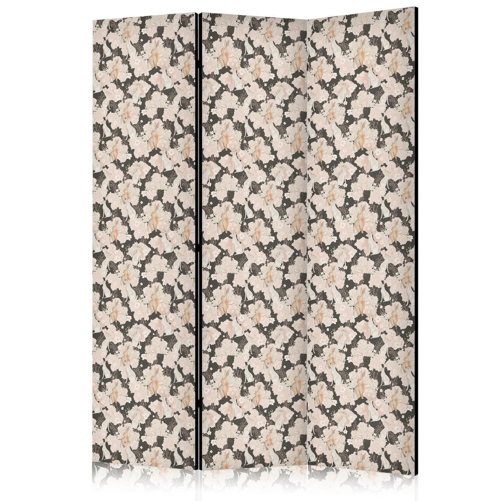 Paravent "Paravent - Among Pink Shrubs - White and Beige Rabbits on a Blooming Meadow"