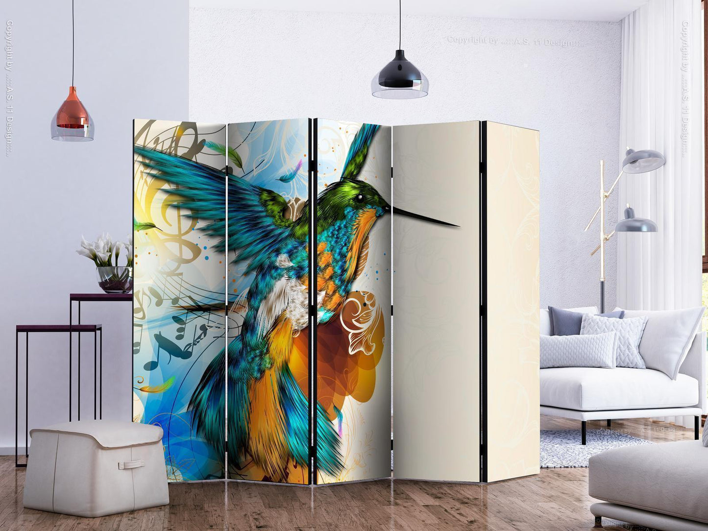 Die spanische Wand kann sowohl im Wohnzimmer, Schlafzimmer, Kinderzimmer, Badezimmer als auch in der Küche aufgestellt werden. Viele Büro-, Restaurant- und Clubbesitzer entscheiden sich häufig für diese dekorative Lösung in ihren Räumlichkeiten. Die spanische Wand "Paravent - Bird's Music II" ist aus geruchsneutralen Materialien hergestellt, die sicher sind und daher keine Allergien auslösen. Es ist eine vielseitige Dekorationsmöglichkeit, die viele Vorteile hat. Der Hauptvorteil ist, dass diese Dekoration leicht zu bewegen ist, so dass sie schnell und einfach neu positioniert werden kann. Wichtig ist, dass die inneren Trennwände einen UV-Schutz haben, so dass die Farben auch im Laufe der Jahre intensiv bleiben. Der Raumteiler hat Designs, die die Einrichtung jedes Raumes ergänzen können.Details zur Produktsicherheit