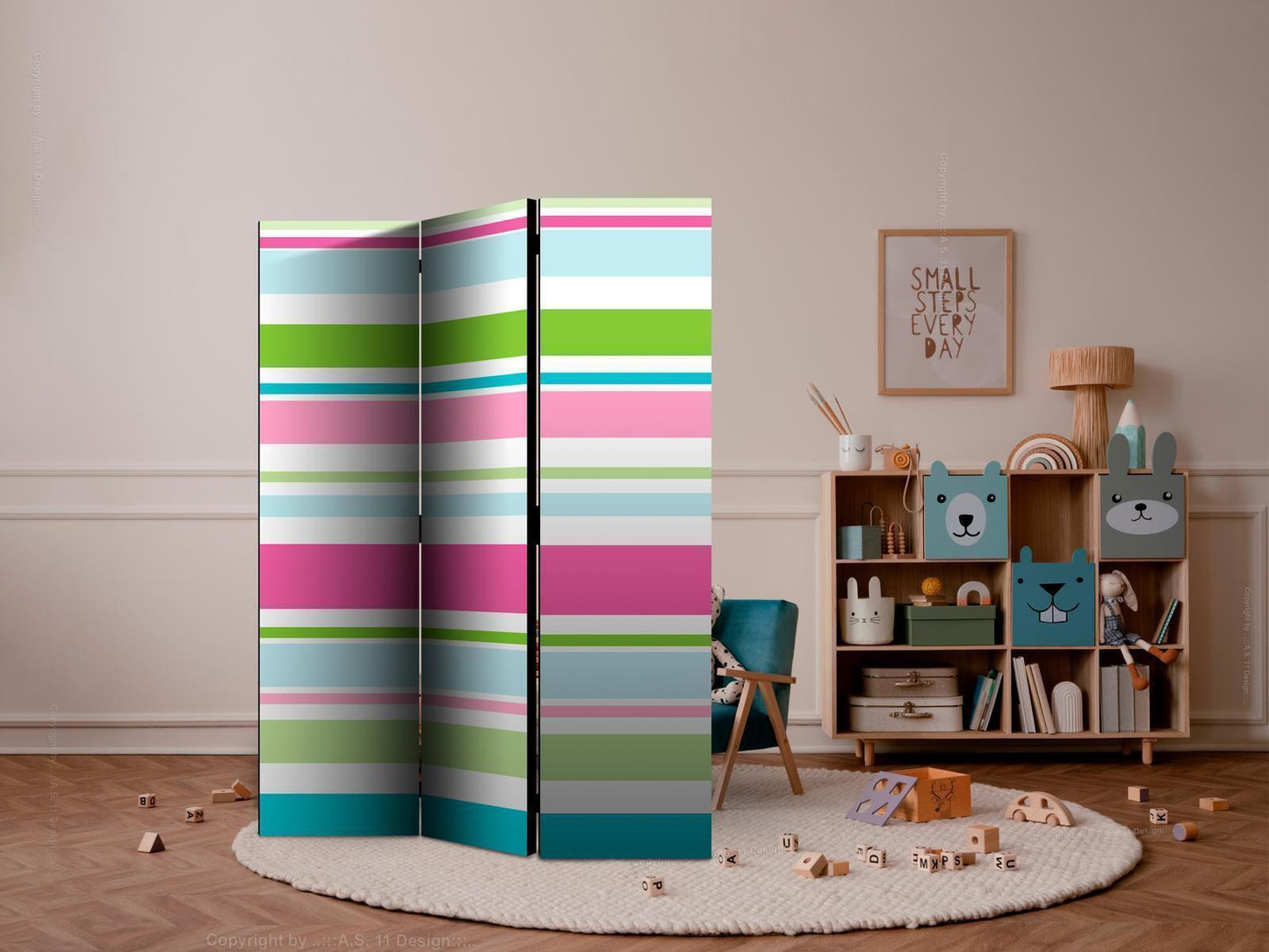 Die spanische Wand kann sowohl im Wohnzimmer, Schlafzimmer, Kinderzimmer, Badezimmer als auch in der Küche aufgestellt werden. Viele Büro-, Restaurant- und Clubbesitzer entscheiden sich häufig für diese dekorative Lösung in ihren Räumlichkeiten. Die spanische Wand "Paravent - Bright stripes" ist aus geruchsneutralen Materialien hergestellt, die sicher sind und daher keine Allergien auslösen. Es ist eine vielseitige Dekorationsmöglichkeit, die viele Vorteile hat. Der Hauptvorteil ist, dass diese Dekoration leicht zu bewegen ist, so dass sie schnell und einfach neu positioniert werden kann. Wichtig ist, dass die inneren Trennwände einen UV-Schutz haben, so dass die Farben auch im Laufe der Jahre intensiv bleiben. Der Raumteiler hat Designs, die die Einrichtung jedes Raumes ergänzen können.Details zur Produktsicherheit