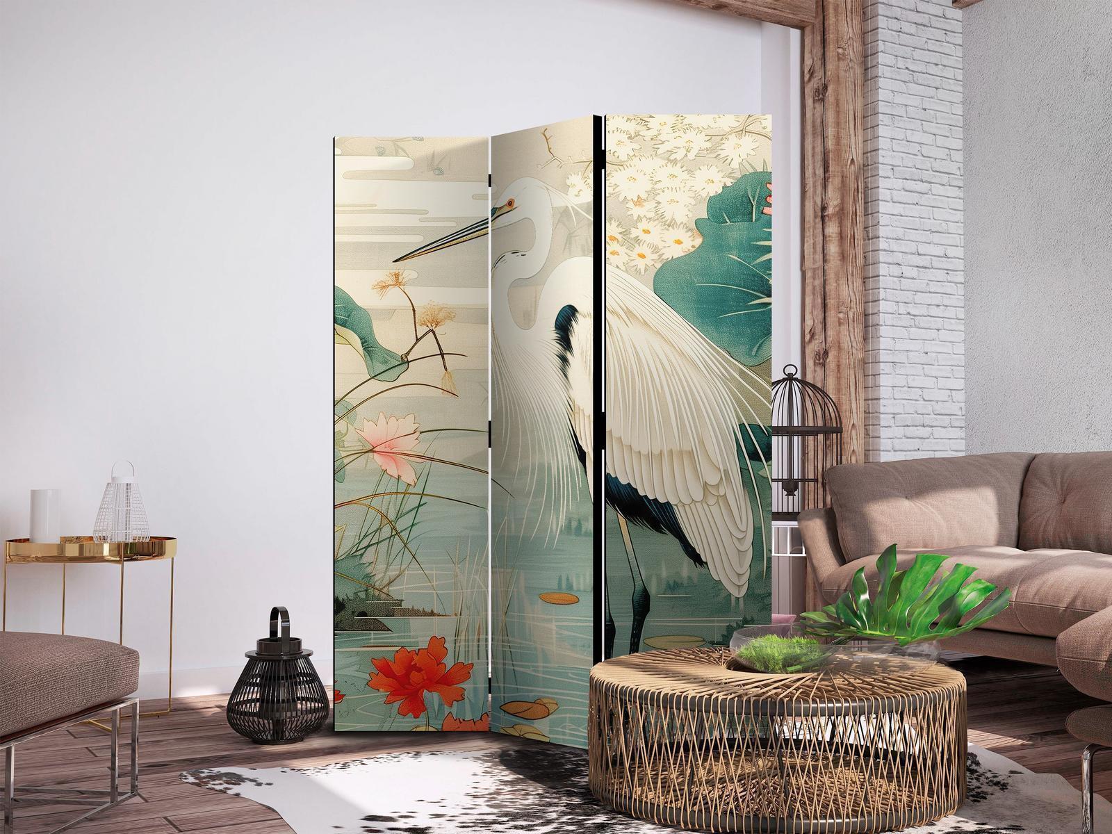 Paravent "Paravent - By an Asian pond - an illustration in the style of a Japanese engraving, depicting a heron"