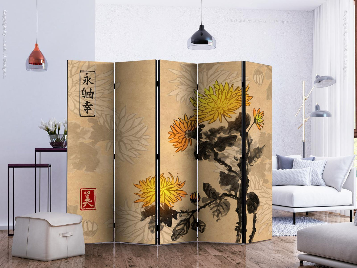 Die spanische Wand kann sowohl im Wohnzimmer, Schlafzimmer, Kinderzimmer, Badezimmer als auch in der Küche aufgestellt werden. Viele Büro-, Restaurant- und Clubbesitzer entscheiden sich häufig für diese dekorative Lösung in ihren Räumlichkeiten. Die spanische Wand "Paravent - Chrysanthemums II" ist aus geruchsneutralen Materialien hergestellt, die sicher sind und daher keine Allergien auslösen. Es ist eine vielseitige Dekorationsmöglichkeit, die viele Vorteile hat. Der Hauptvorteil ist, dass diese Dekoration leicht zu bewegen ist, so dass sie schnell und einfach neu positioniert werden kann. Wichtig ist, dass die inneren Trennwände einen UV-Schutz haben, so dass die Farben auch im Laufe der Jahre intensiv bleiben. Der Raumteiler hat Designs, die die Einrichtung jedes Raumes ergänzen können.Details zur Produktsicherheit