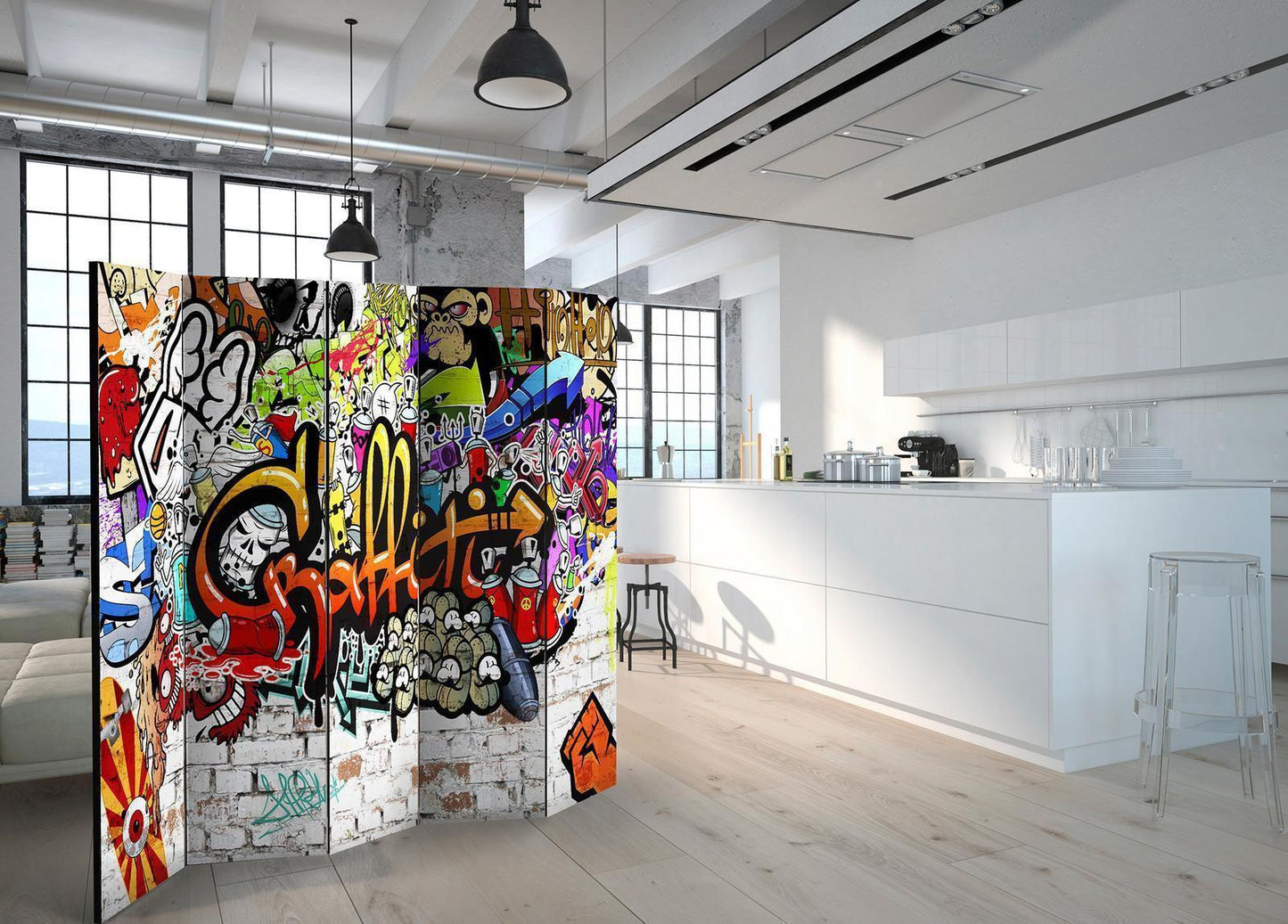 Die spanische Wand kann sowohl im Wohnzimmer, Schlafzimmer, Kinderzimmer, Badezimmer als auch in der Küche aufgestellt werden. Viele Büro-, Restaurant- und Clubbesitzer entscheiden sich häufig für diese dekorative Lösung in ihren Räumlichkeiten. Die spanische Wand "Paravent - Colourful Style" ist aus geruchsneutralen Materialien hergestellt, die sicher sind und daher keine Allergien auslösen. Es ist eine vielseitige Dekorationsmöglichkeit, die viele Vorteile hat. Der Hauptvorteil ist, dass diese Dekoration leicht zu bewegen ist, so dass sie schnell und einfach neu positioniert werden kann. Wichtig ist, dass die inneren Trennwände einen UV-Schutz haben, so dass die Farben auch im Laufe der Jahre intensiv bleiben. Der Raumteiler hat Designs, die die Einrichtung jedes Raumes ergänzen können.Details zur Produktsicherheit