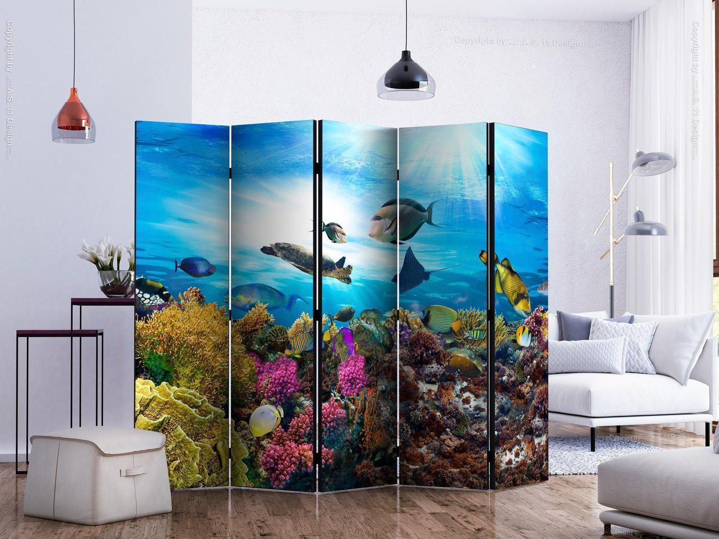 Die spanische Wand kann sowohl im Wohnzimmer, Schlafzimmer, Kinderzimmer, Badezimmer als auch in der Küche aufgestellt werden. Viele Büro-, Restaurant- und Clubbesitzer entscheiden sich häufig für diese dekorative Lösung in ihren Räumlichkeiten. Die spanische Wand "Paravent - Coral reef II" ist aus geruchsneutralen Materialien hergestellt, die sicher sind und daher keine Allergien auslösen. Es ist eine vielseitige Dekorationsmöglichkeit, die viele Vorteile hat. Der Hauptvorteil ist, dass diese Dekoration leicht zu bewegen ist, so dass sie schnell und einfach neu positioniert werden kann. Wichtig ist, dass die inneren Trennwände einen UV-Schutz haben, so dass die Farben auch im Laufe der Jahre intensiv bleiben. Der Raumteiler hat Designs, die die Einrichtung jedes Raumes ergänzen können.Details zur Produktsicherheit