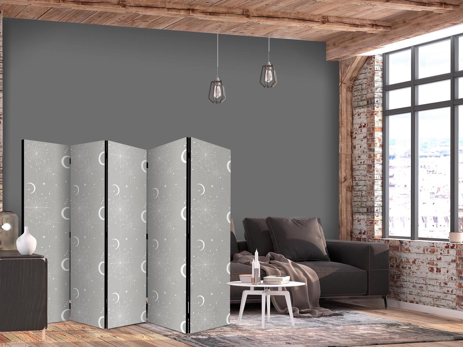 Paravent - Cosmic Fireworks - Elegant Pattern with Moons and Stars on a Gray Background